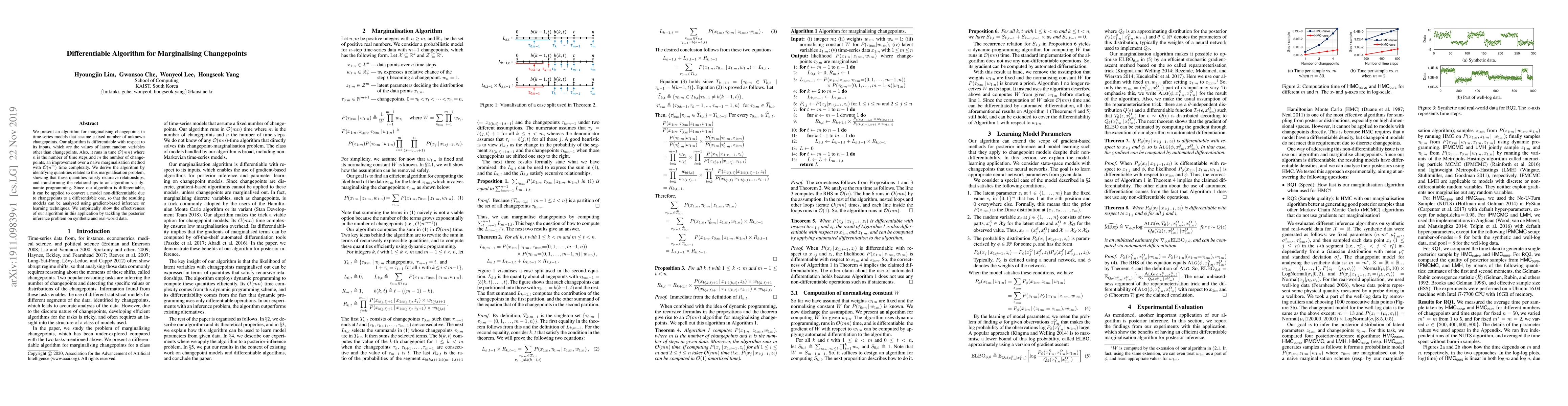 We present an algorithm for marginalising changepoints in time-series models that assume a fixed number of unknown changepoints. Our algorithm is differentiable with respect to its inputs, which are the values of latent random variables other than changepoints. Also, it runs in time O(mn) where n is the number of time steps and m the number of changepoints, an improvement over a naive marginalisation method with O(n^m) time complexity. We derive the algorithm by identifying quantities related to this marginalisation problem, showing that these quantities satisfy recursive relationships, and transforming the relationships to an algorithm via dynamic programming. Since our algorithm is differentiable, it can be applied to convert a model non-differentiable due to changepoints to a differentiable one, so that the resulting models can be analysed using gradient-based inference or learning techniques. We empirically show the effectiveness of our algorithm in this application by tackling the posterior inference problem on synthetic and real-world data.