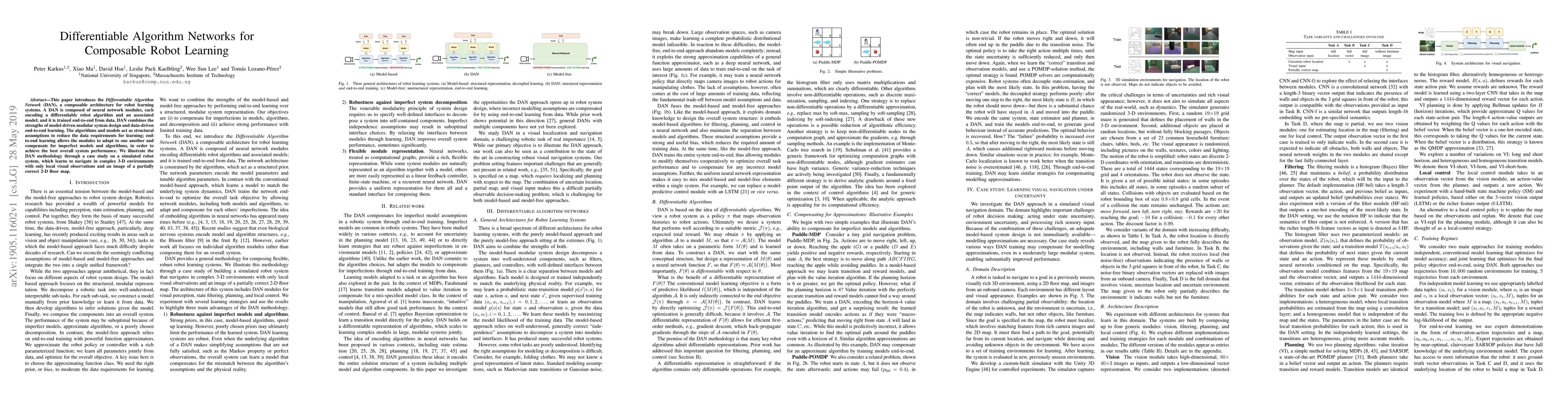 This paper proposes the Differentiable Algorithm Network (DAN), a composable architecture for robot learning that combines neural network modules encoding differentiable algorithms and models, trained end-to-end to optimize overall system performance. The methodology is demonstrated through a simulated robot navigating complex 3-D environments using local visual data and a partial 2-D map.
