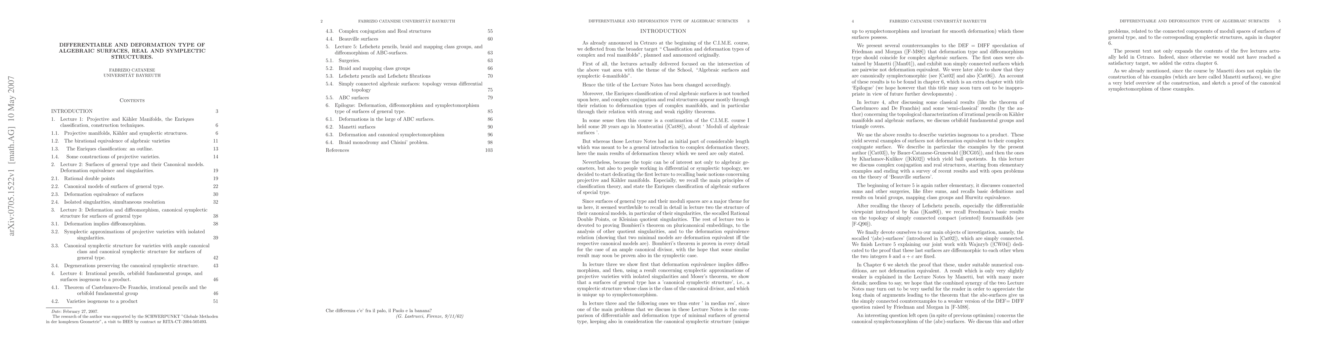 This research paper explores the deformation type of algebraic surfaces, including real and symplectic structures, using techniques from projective and K"ahler manifolds, canonical models, and symplectic geometry.