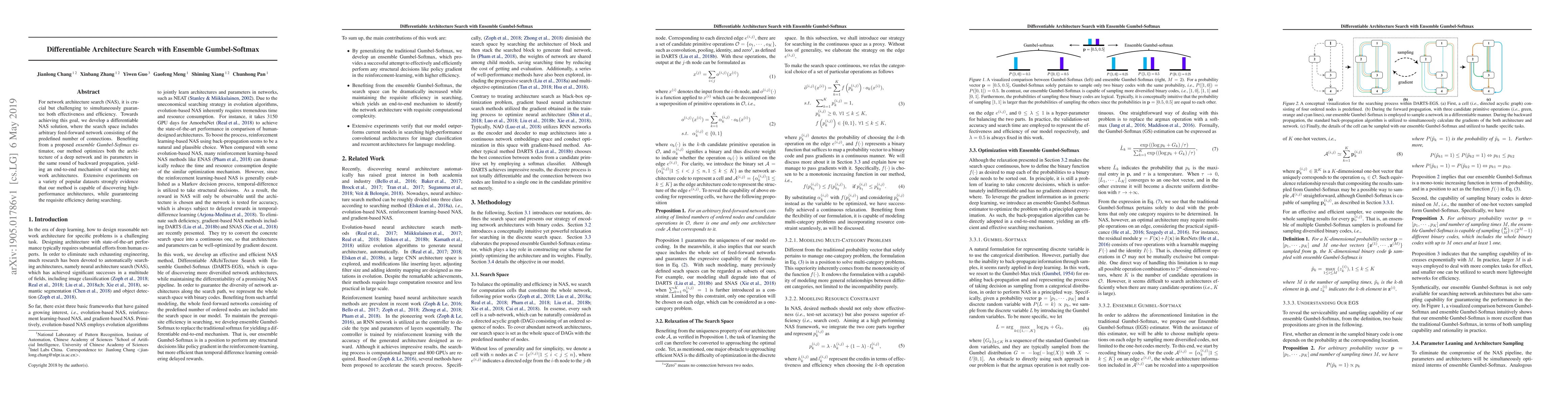 This paper proposes a differentiable network architecture search method using an ensemble Gumbel-Softmax estimator, enabling simultaneous optimization of network architecture and parameters in a single backward pass. The method efficiently discovers high-performance architectures across various datasets.