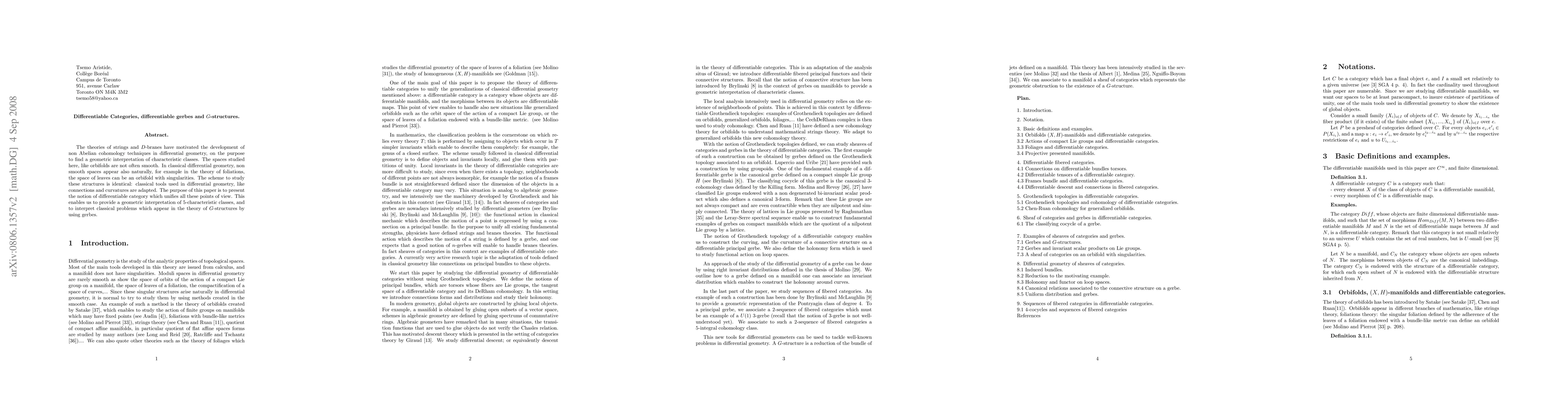 The theories of strings and $D$-branes have motivated the development of non Abelian cohomology techniques in differential geometry, on the purpose to find a geometric interpretation of characteristic classes. The spaces studied here, like orbifolds are not often smooth. In classical differential geometry, non smooth spaces appear also naturally, for example in the theory of foliations, the space of leaves can be an orbifold with singularities. The scheme to study these structures is identical: classical tools used in differential geometry, like connections, curvature are adapted. The purpose of this paper is to present the notion of differential category which unifies all these points of view. This enables us to provide a geometric interpretation of 5-characteristic classes, and to interpret classical problems which appear in the theory of $G$-structures by using gerbes.