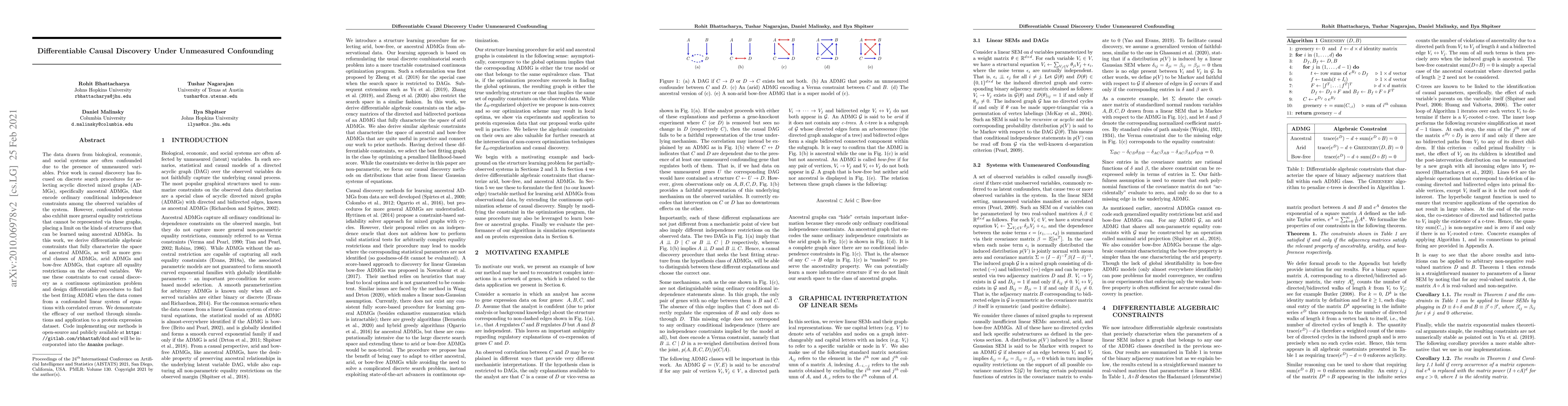 This paper proposes differentiable algebraic constraints to characterize ancestral and general acyclic directed mixed graphs (ADMGs) for causal discovery in systems with unmeasured confounding. It casts causal discovery as a continuous optimization problem and demonstrates its effectiveness through simulations and a protein expression dataset.