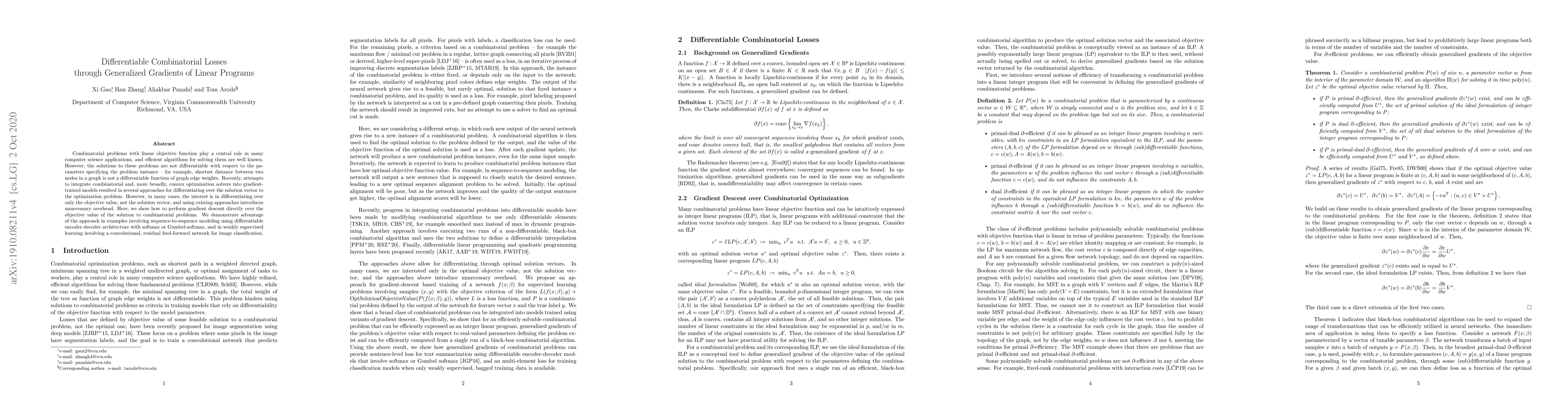 When samples have internal structure, we often see a mismatch between the objective optimized during training and the model's goal during inference. For example, in sequence-to-sequence modeling we are interested in high-quality translated sentences, but training typically uses maximum likelihood at the word level. The natural training-time loss would involve a combinatorial problem -- dynamic programming-based global sequence alignment -- but solutions to combinatorial problems are not differentiable with respect to their input parameters, so surrogate, differentiable losses are used instead. Here, we show how to perform gradient descent over combinatorial optimization algorithms that involve continuous parameters, for example edge weights, and can be efficiently expressed as linear programs. We demonstrate usefulness of gradient descent over combinatorial optimization in sequence-to-sequence modeling using differentiable encoder-decoder architecture with softmax or Gumbel-softmax, and in image classification in a weakly supervised setting where instead of the correct class for each photo, only groups of photos labeled with correct but unordered set of classes are available during training.