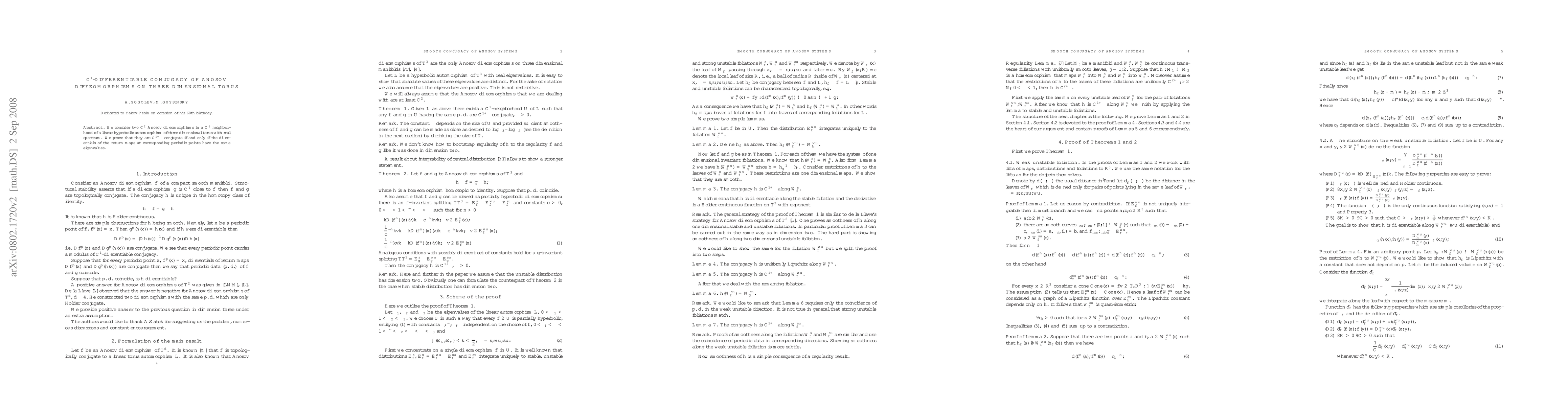Summary: This paper proves that two C^2 Anosov diffeomorphisms on a three-dimensional torus are C^1+ conjugate if their differentials at corresponding periodic points have identical eigenvalues, establishing a key result in the study of dynamical systems.