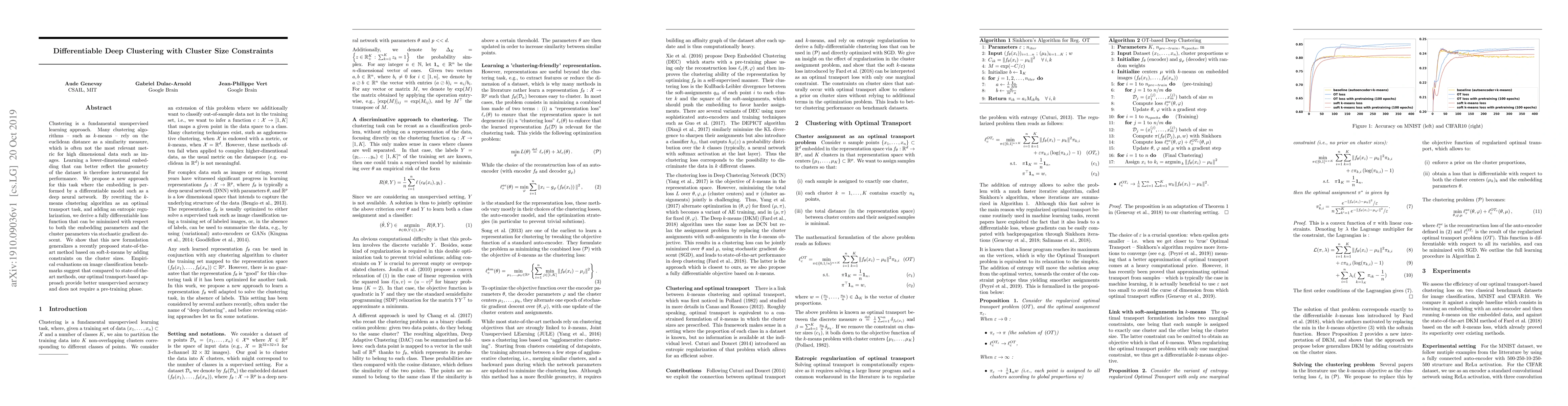 This research introduces a differentiable deep clustering method using a neural network for embedding high-dimensional data like images, improving upon $k$-means. The approach, based on optimal transport with entropic regularization, allows joint optimization of embedding and cluster parameters, generalizing soft-$k$-means and adding cluster size constraints. Empirical tests show better unsupervised accuracy on image benchmarks without needing pre-training.