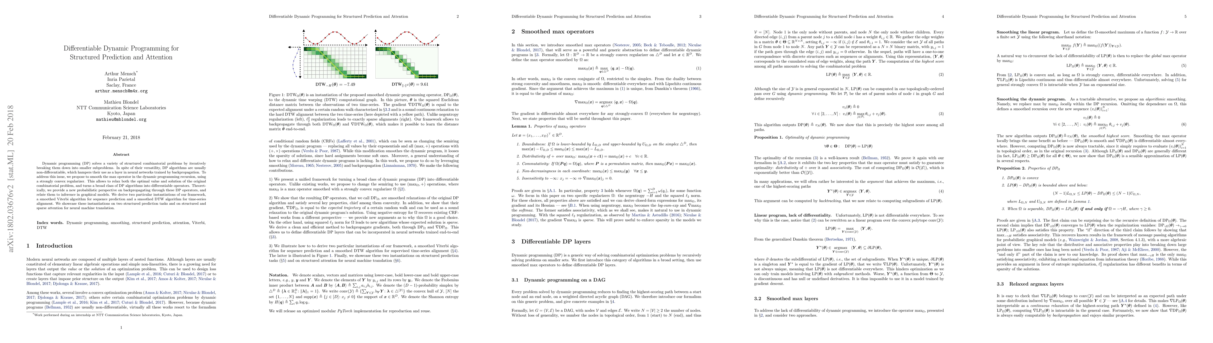 This paper proposes differentiable dynamic programming by smoothing the max operator, enabling structured prediction tasks and attention mechanisms in neural networks. It introduces smoothed versions of the Viterbi algorithm and DTW, demonstrating their effectiveness in sequence prediction and time-series alignment.