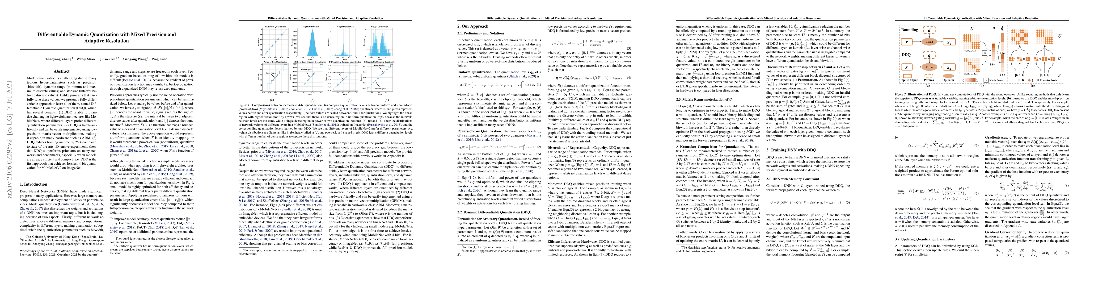 This paper introduces Differentiable Dynamic Quantization (DDQ), a fully differentiable method to adaptively learn quantization parameters like precision and dynamic range, outperforming prior arts on efficient and compact models. DDQ quantizes lightweight architectures like MobileNets effectively and is hardware-friendly for implementations on platforms such as ARM.