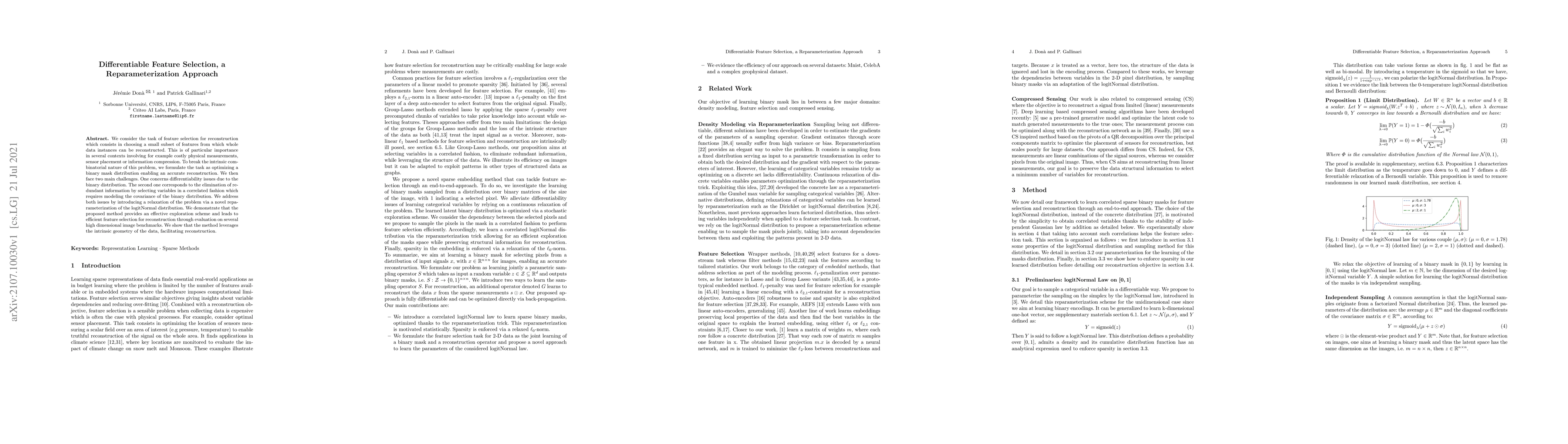 This paper proposes a differentiable feature selection method for reconstruction tasks, addressing combinatorial complexity and redundancy by reparameterizing the logit-normal distribution. The approach efficiently explores feature subsets and is validated on high-dimensional image benchmarks, demonstrating effective selection and exploitation of data geometry for accurate reconstruction.