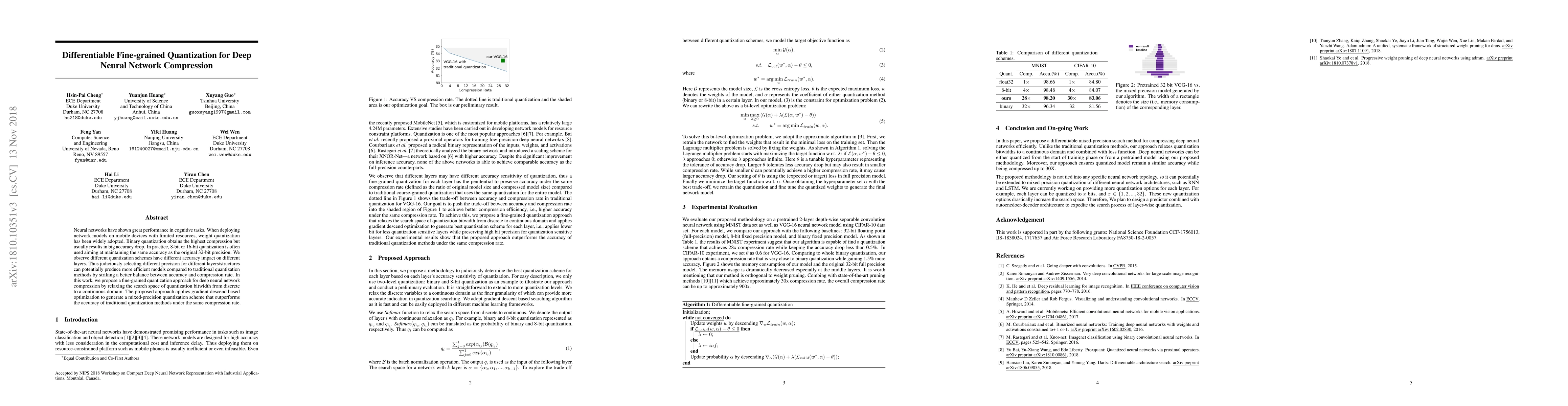 This paper proposes a differentiable fine-grained quantization method for deep neural network compression, optimizing quantization bitwidth in a continuous domain to achieve better accuracy-compression trade-offs compared to traditional quantization methods. The approach uses gradient descent to generate mixed-precision quantization schemes.
