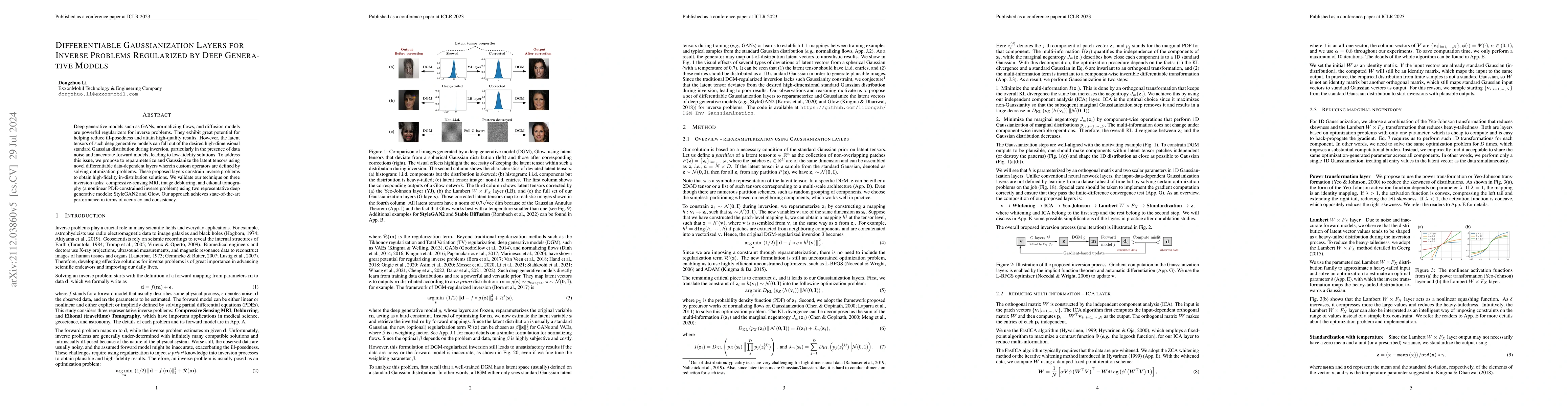 This paper proposes differentiable Gaussianization layers to regularize inverse problems using deep generative models, ensuring latent tensors maintain a high-dimensional standard Gaussian distribution. The method achieves state-of-the-art results in compressive-sensing MRI, image deblurring, and eikonal tomography.