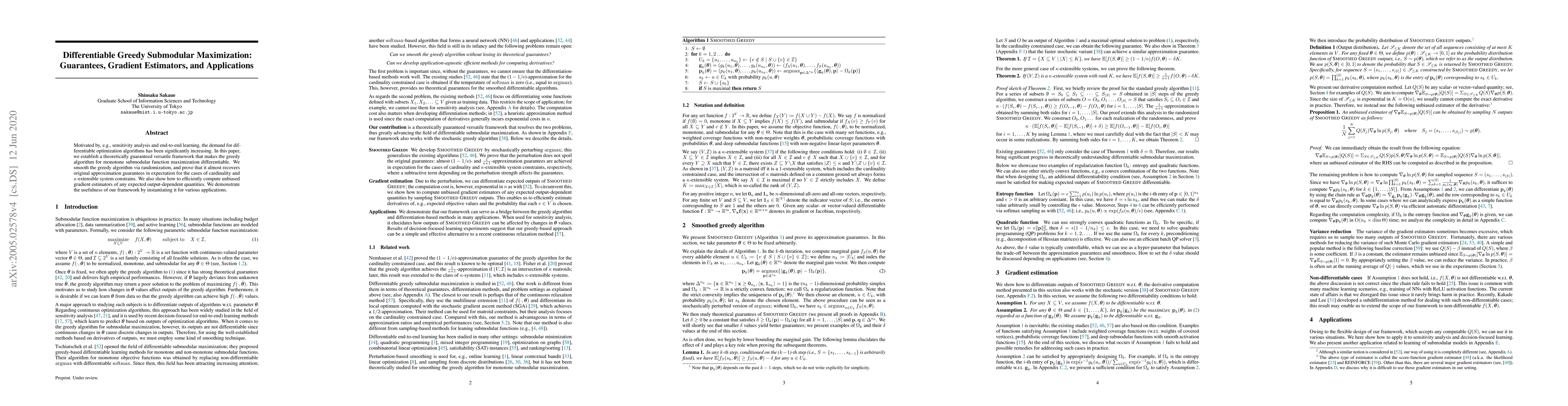This paper presents a differentiable framework for the greedy algorithm in submodular maximization, ensuring theoretical guarantees while maintaining approximation ratios under cardinality and $\kappa$-extensible constraints. It also introduces efficient gradient estimators for output-dependent quantities and showcases its applications in various fields.