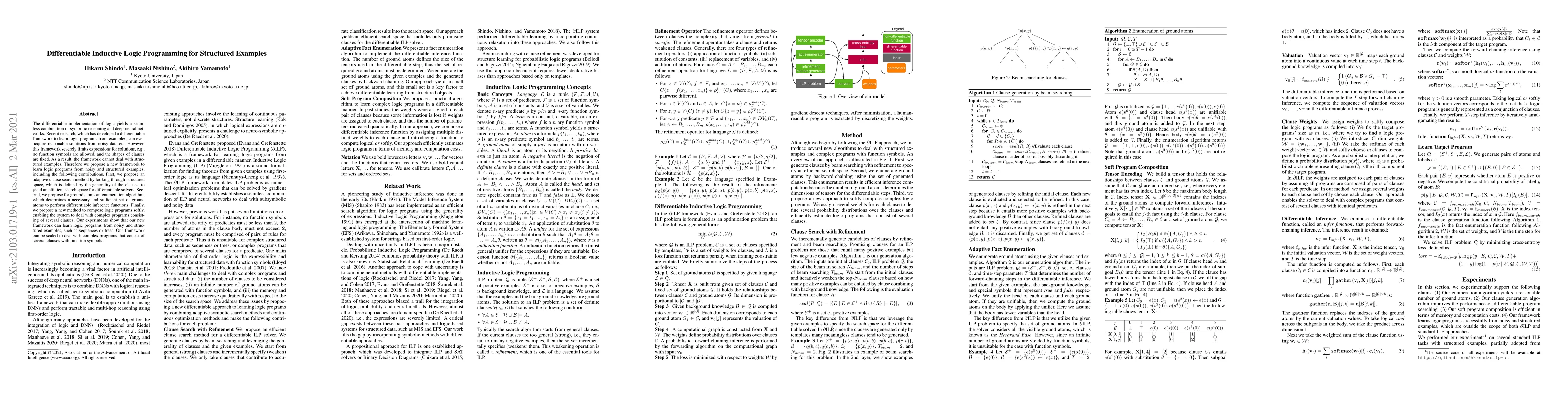This paper proposes a differentiable framework for learning logic programs from noisy and structured examples, introducing an adaptive clause search method, an enumeration algorithm for ground atoms, and a soft composition method for complex logic programs to handle datasets like sequences and trees. The framework overcomes limitations in existing methods by allowing function symbols and flexible clause shapes.
