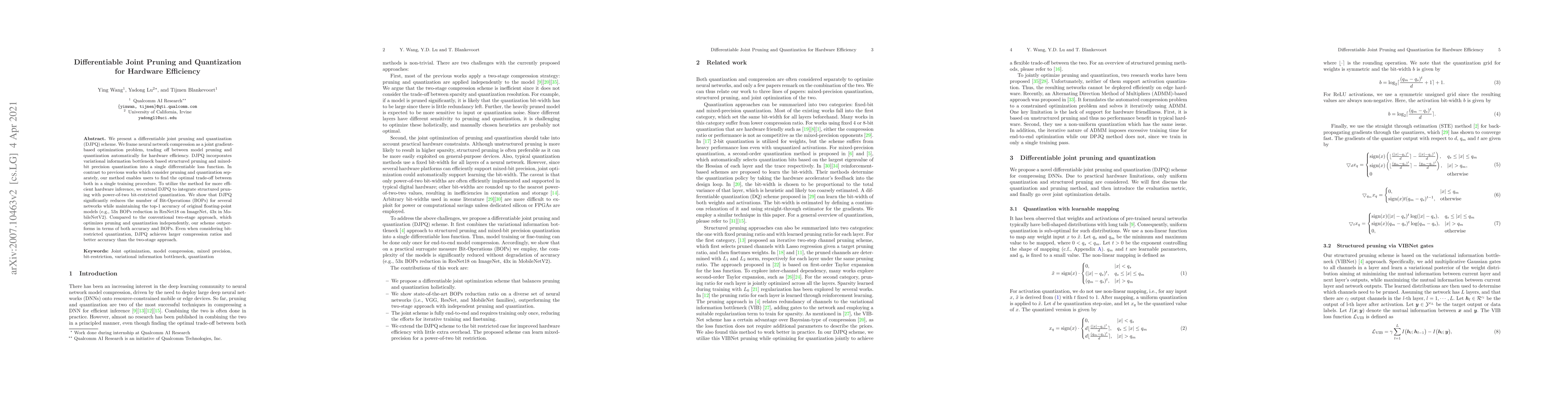 This paper introduces a differentiable joint pruning and quantization (DJPQ) scheme that optimizes neural network compression by simultaneously adjusting model pruning and quantization for hardware efficiency. DJPQ achieves significant reductions in Bit-Operations (BOPs) while maintaining top-1 accuracy, outperforming conventional two-stage methods in both compression ratio and accuracy.