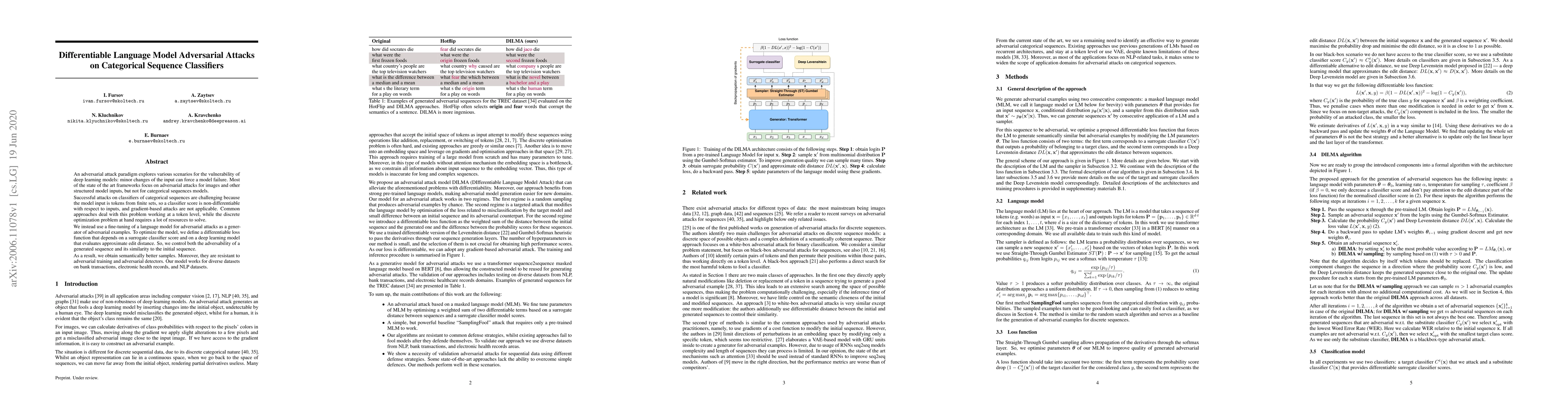 This paper proposes a novel adversarial attack method for categorical sequence classifiers using fine-tuned language models. The approach defines a differentiable loss function to generate adversarial examples that maintain semantic similarity while being resistant to adversarial training and detection.