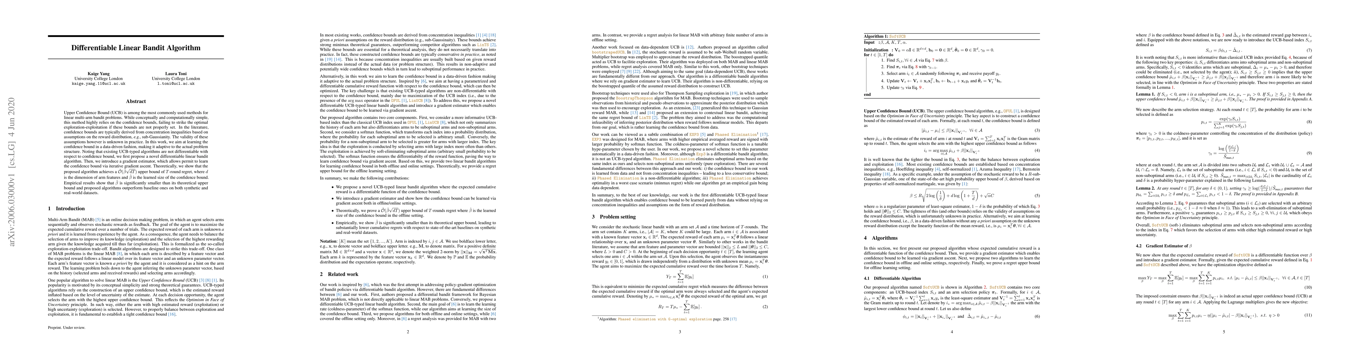 Upper Confidence Bound (UCB) is arguably the most commonly used method for linear multi-arm bandit problems. While conceptually and computationally simple, this method highly relies on the confidence bounds, failing to strike the optimal exploration-exploitation if these bounds are not properly set. In the literature, confidence bounds are typically derived from concentration inequalities based on assumptions on the reward distribution, e.g., sub-Gaussianity. The validity of these assumptions however is unknown in practice. In this work, we aim at learning the confidence bound in a data-driven fashion, making it adaptive to the actual problem structure. Specifically, noting that existing UCB-typed algorithms are not differentiable with respect to confidence bound, we first propose a novel differentiable linear bandit algorithm. Then, we introduce a gradient estimator, which allows the confidence bound to be learned via gradient ascent. Theoretically, we show that the proposed algorithm achieves a $\tilde{\mathcal{O}}(\hat{\beta}\sqrt{dT})$ upper bound of $T$-round regret, where $d$ is the dimension of arm features and $\hat{\beta}$ is the learned size of confidence bound. Empirical results show that $\hat{\beta}$ is significantly smaller than its theoretical upper bound and proposed algorithms outperforms baseline ones on both simulated and real-world datasets.