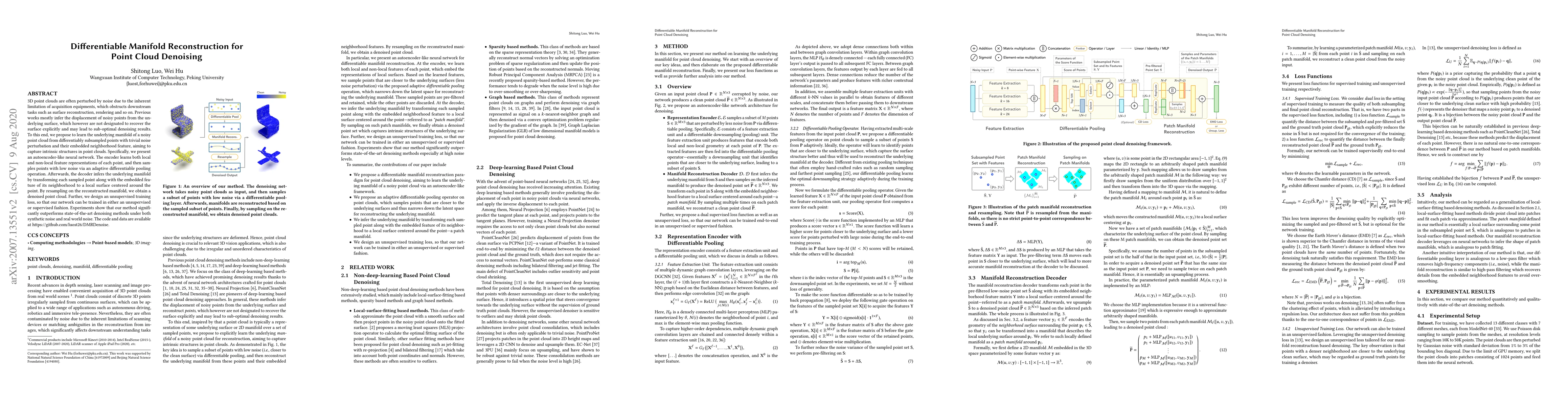 This paper proposes a novel autoencoder-like neural network for denoising 3D point clouds by reconstructing their underlying manifold. The method uses differentiable subsampling and adaptive pooling to sample low-noise points, followed by a decoder that infers the manifold and reconstructs a denoised point cloud, achieving superior results compared to existing methods.
