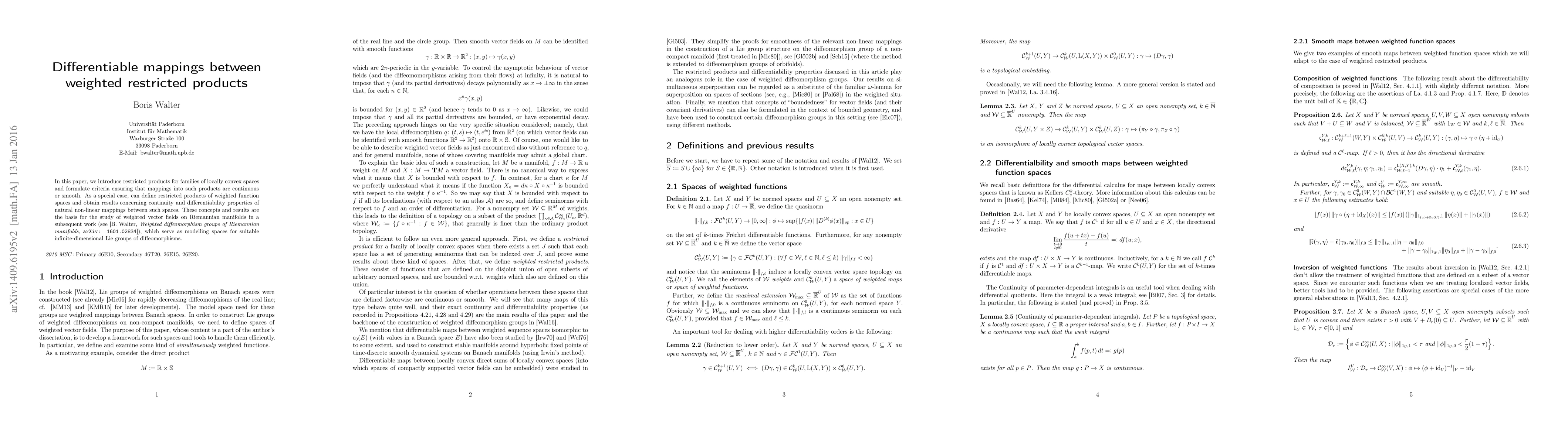 This paper establishes criteria for continuity and smoothness of mappings into restricted products of locally convex spaces, particularly weighted function spaces. It lays the groundwork for studying weighted vector fields on Riemannian manifolds and their associated infinite-dimensional Lie groups of diffeomorphisms.