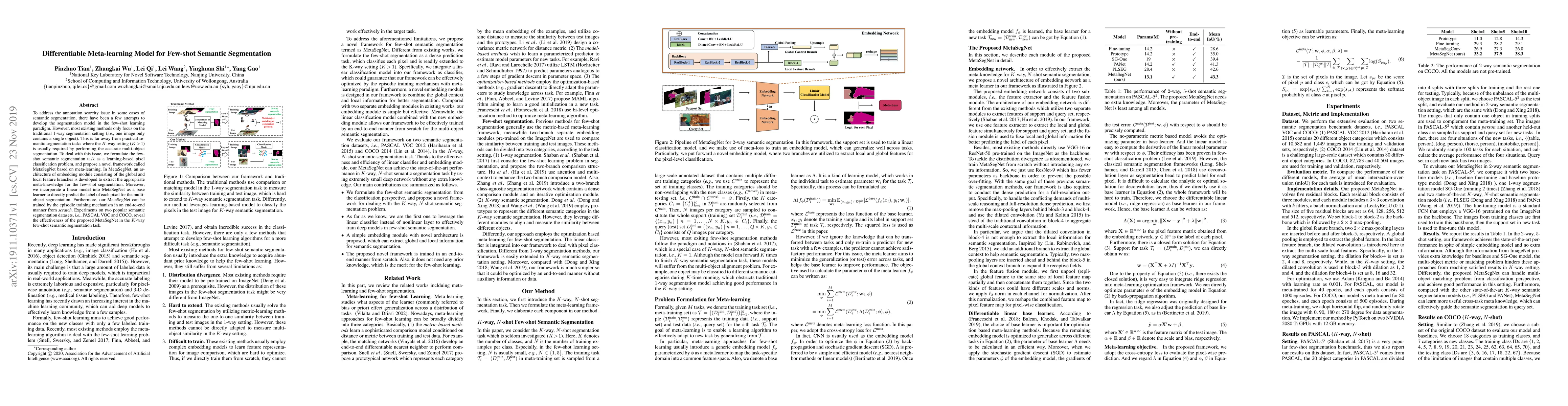 This paper introduces MetaSegNet, a differentiable meta-learning model for K-way few-shot semantic segmentation, addressing the annotation scarcity issue by extracting meta-knowledge through global and local feature branches and employing an end-to-end training mechanism. Experiments on PASCAL VOC and COCO datasets demonstrate its effectiveness in multi-object segmentation tasks.