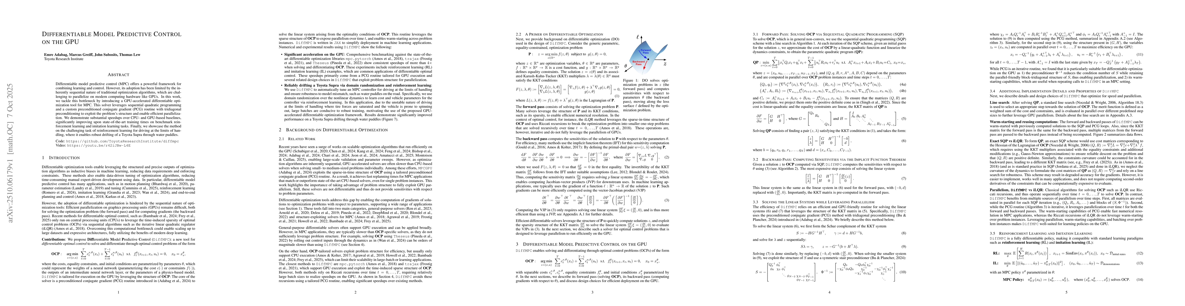 Differentiable model predictive control (MPC) offers a powerful framework for combining learning and control. However, its adoption has been limited by the inherently sequential nature of traditional optimization algorithms, which are challenging to parallelize on modern computing hardware like GPUs. In this work, we tackle this bottleneck by introducing a GPU-accelerated differentiable optimization tool for MPC. This solver leverages sequential quadratic programming and a custom preconditioned conjugate gradient (PCG) routine with tridiagonal preconditioning to exploit the problem's structure and enable efficient parallelization. We demonstrate substantial speedups over CPU- and GPU-based baselines, significantly improving upon state-of-the-art training times on benchmark reinforcement learning and imitation learning tasks. Finally, we showcase the method on the challenging task of reinforcement learning for driving at the limits of handling, where it enables robust drifting of a Toyota Supra through water puddles.