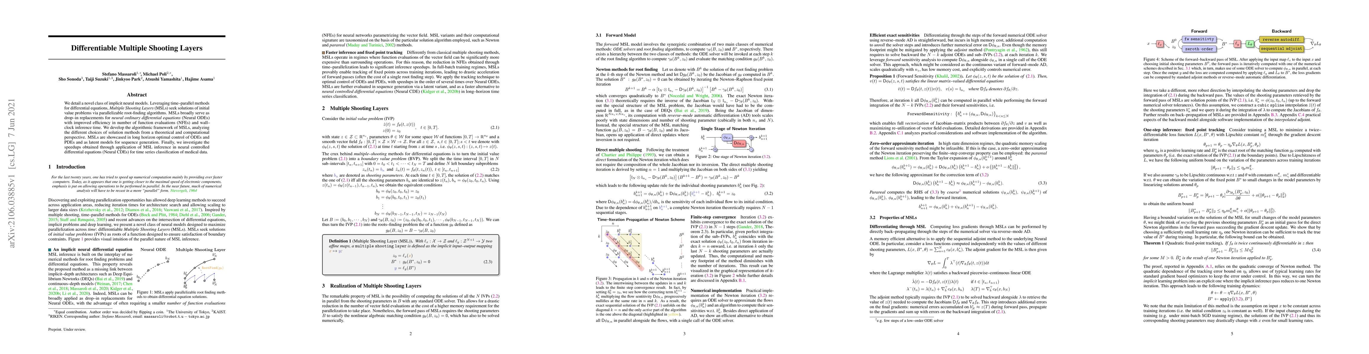 We detail a novel class of implicit neural models. Leveraging time-parallel methods for differential equations, Multiple Shooting Layers (MSLs) seek solutions of initial value problems via parallelizable root-finding algorithms. MSLs broadly serve as drop-in replacements for neural ordinary differential equations (Neural ODEs) with improved efficiency in number of function evaluations (NFEs) and wall-clock inference time. We develop the algorithmic framework of MSLs, analyzing the different choices of solution methods from a theoretical and computational perspective. MSLs are showcased in long horizon optimal control of ODEs and PDEs and as latent models for sequence generation. Finally, we investigate the speedups obtained through application of MSL inference in neural controlled differential equations (Neural CDEs) for time series classification of medical data.