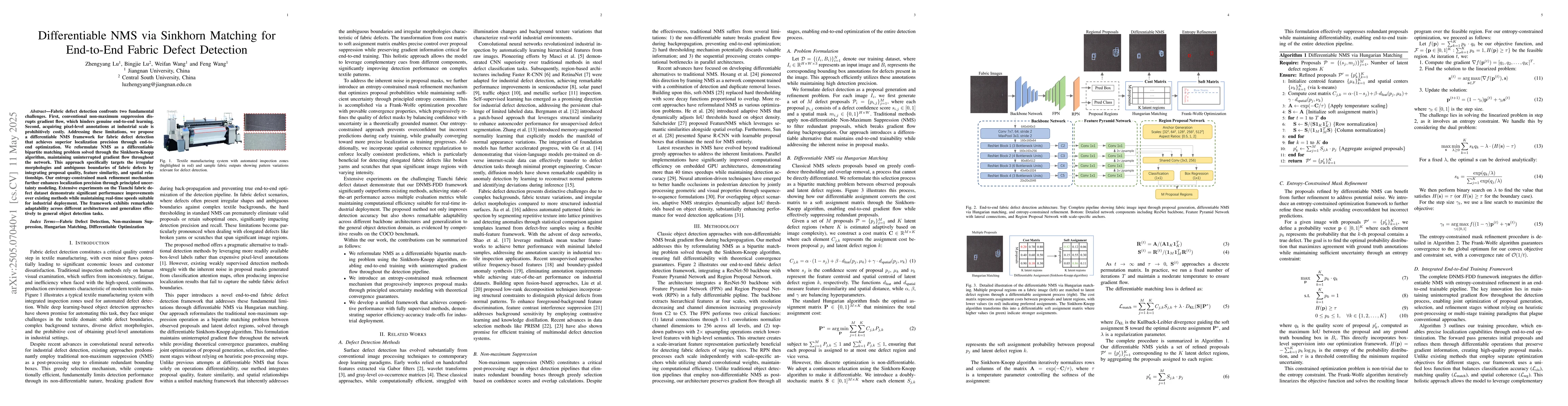 This research introduces a differentiable non-maximum suppression (NMS) method for fabric defect detection using Sinkhorn matching, enabling end-to-end learning and improved localization. It outperforms existing methods on the Tianchi dataset, generalizes to other object detection tasks, and maintains real-time speed for industrial applications.
