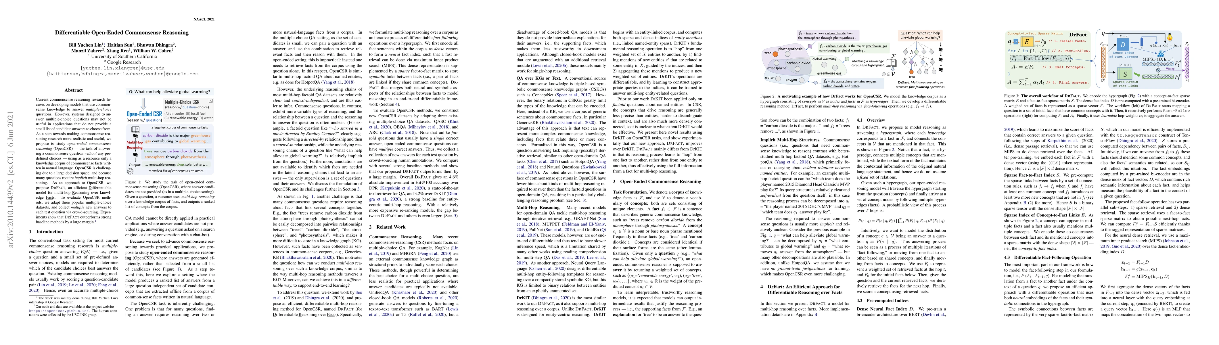 This paper proposes a novel approach, DrFact, for open-ended commonsense reasoning (OpenCSR) that aims to answer commonsense questions without predefined choices using only a natural language corpus of commonsense facts. The method outperforms existing models on adapted benchmarks, demonstrating effective multi-hop reasoning.