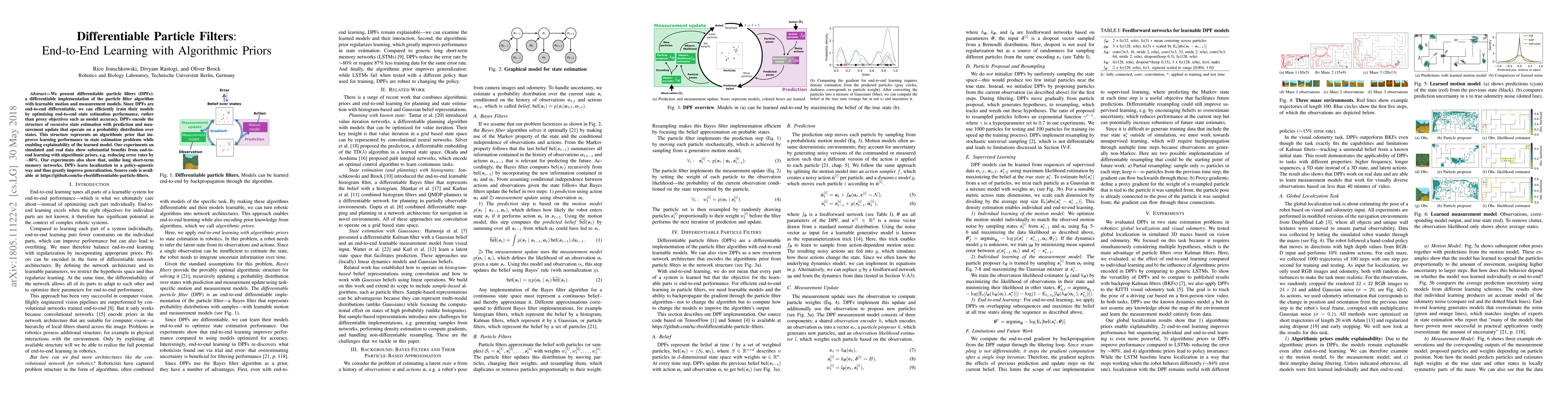 Differentiable particle filters (DPFs) enable end-to-end learning for state estimation by incorporating learnable motion and measurement models, optimizing performance directly rather than proxy metrics. This approach significantly reduces error rates and enhances generalization compared to traditional methods.