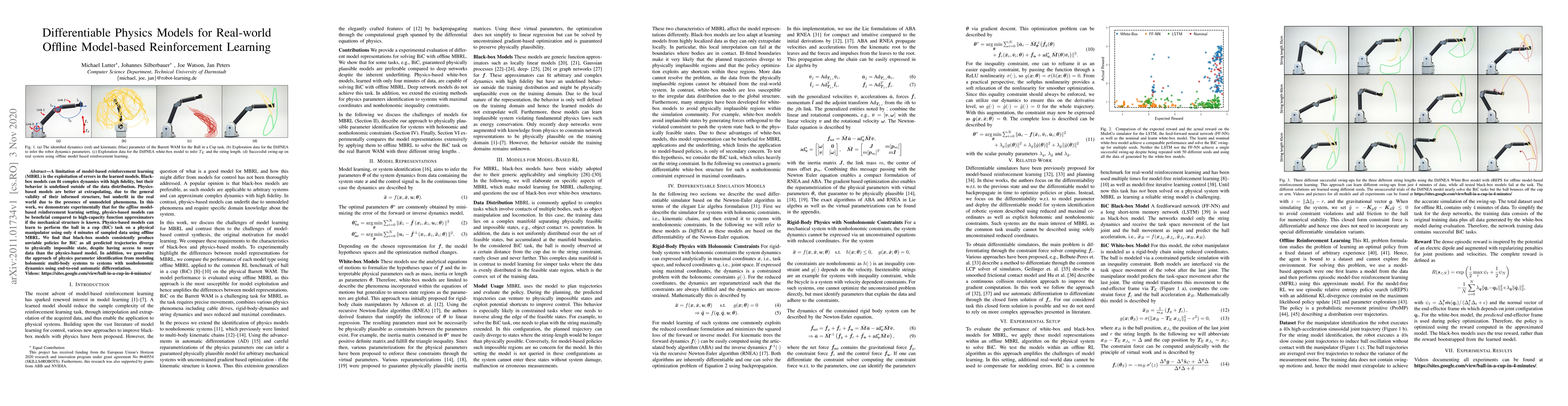 A limitation of model-based reinforcement learning (MBRL) is the exploitation of errors in the learned models. Black-box models can fit complex dynamics with high fidelity, but their behavior is undefined outside of the data distribution.Physics-based models are better at extrapolating, due to the general validity of their informed structure, but underfit in the real world due to the presence of unmodeled phenomena. In this work, we demonstrate experimentally that for the offline model-based reinforcement learning setting, physics-based models can be beneficial compared to high-capacity function approximators if the mechanical structure is known. Physics-based models can learn to perform the ball in a cup (BiC) task on a physical manipulator using only 4 minutes of sampled data using offline MBRL. We find that black-box models consistently produce unviable policies for BiC as all predicted trajectories diverge to physically impossible state, despite having access to more data than the physics-based model. In addition, we generalize the approach of physics parameter identification from modeling holonomic multi-body systems to systems with nonholonomic dynamics using end-to-end automatic differentiation. Videos: https://sites.google.com/view/ball-in-a-cup-in-4-minutes/