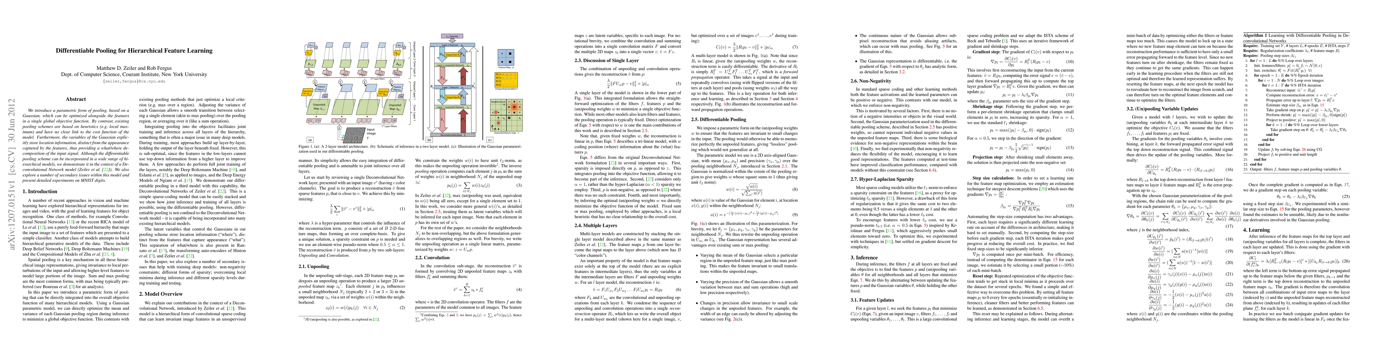 We introduce a parametric form of pooling, based on a Gaussian, which can be optimized alongside the features in a single global objective function. By contrast, existing pooling schemes are based on heuristics (e.g. local maximum) and have no clear link to the cost function of the model. Furthermore, the variables of the Gaussian explicitly store location information, distinct from the appearance captured by the features, thus providing a what/where decomposition of the input signal. Although the differentiable pooling scheme can be incorporated in a wide range of hierarchical models, we demonstrate it in the context of a Deconvolutional Network model (Zeiler et al. ICCV 2011). We also explore a number of secondary issues within this model and present detailed experiments on MNIST digits.