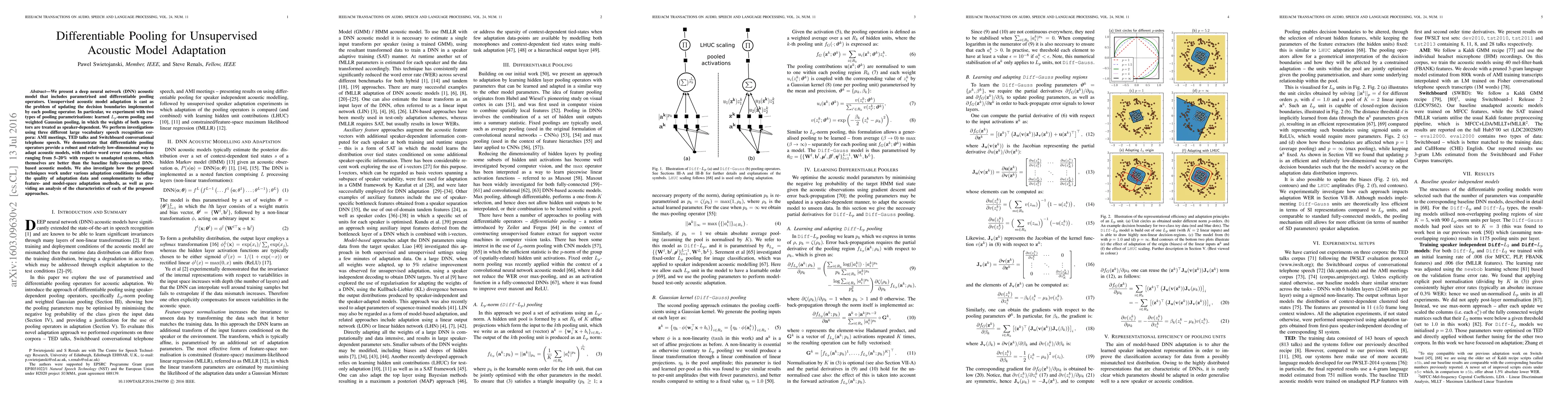 This paper introduces a DNN acoustic model with differentiable pooling for unsupervised adaptation, achieving 5-20% relative word error rate reductions across various corpora. The study explores two pooling types—learned $L_p$-norm and weighted Gaussian—and assesses their effectiveness under different adaptation conditions.