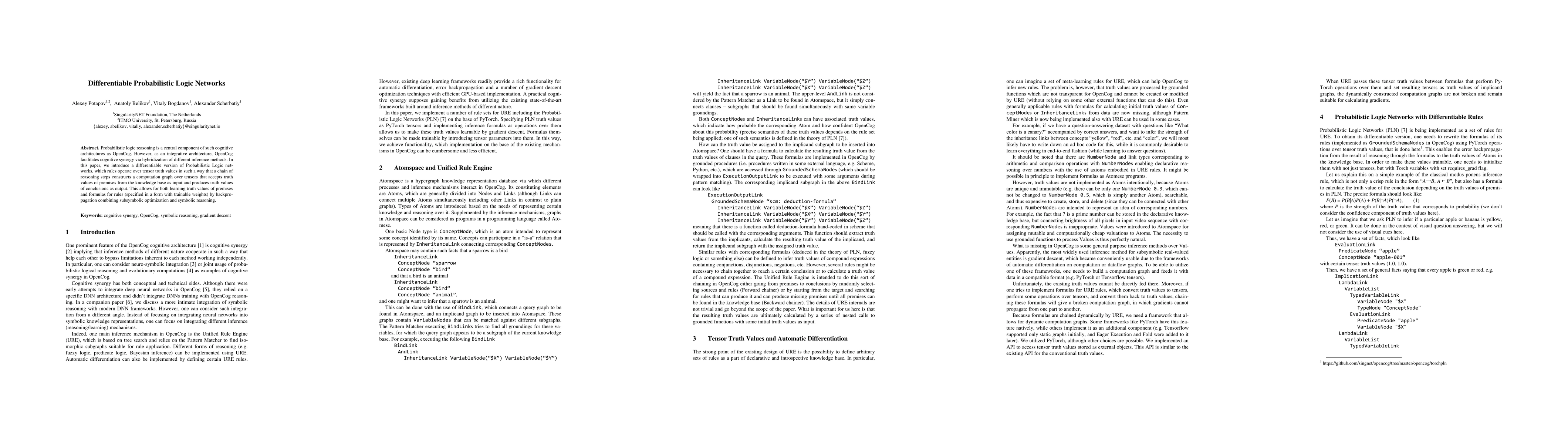 Probabilistic logic reasoning is a central component of such cognitive architectures as OpenCog. However, as an integrative architecture, OpenCog facilitates cognitive synergy via hybridization of different inference methods. In this paper, we introduce a differentiable version of Probabilistic Logic networks, which rules operate over tensor truth values in such a way that a chain of reasoning steps constructs a computation graph over tensors that accepts truth values of premises from the knowledge base as input and produces truth values of conclusions as output. This allows for both learning truth values of premises and formulas for rules (specified in a form with trainable weights) by backpropagation combining subsymbolic optimization and symbolic reasoning.
