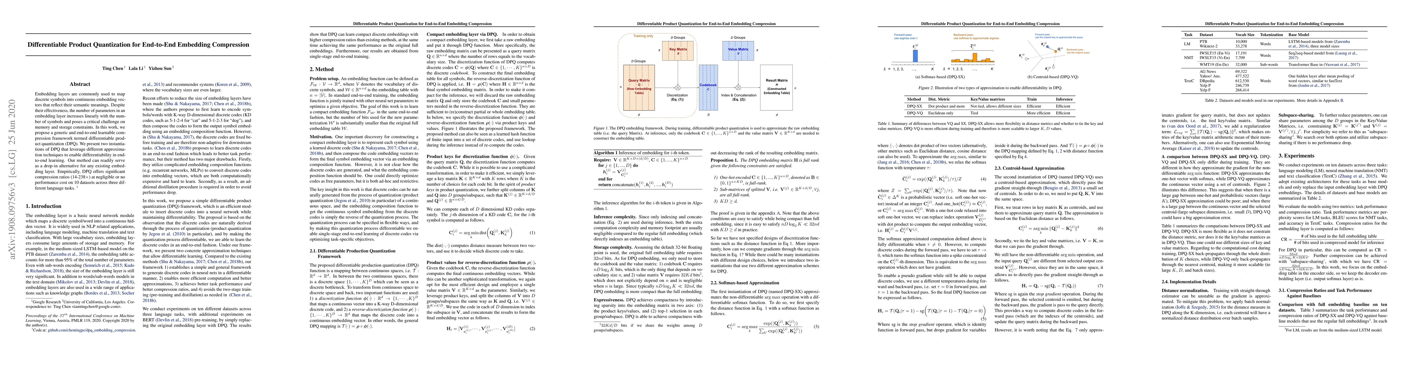 This paper introduces differentiable product quantization (DPQ), a novel framework for compressing embedding layers in neural networks, offering significant memory savings (14-238$\times$) with minimal performance loss across various language tasks. DPQ enables end-to-end learning and can replace existing embedding layers directly.