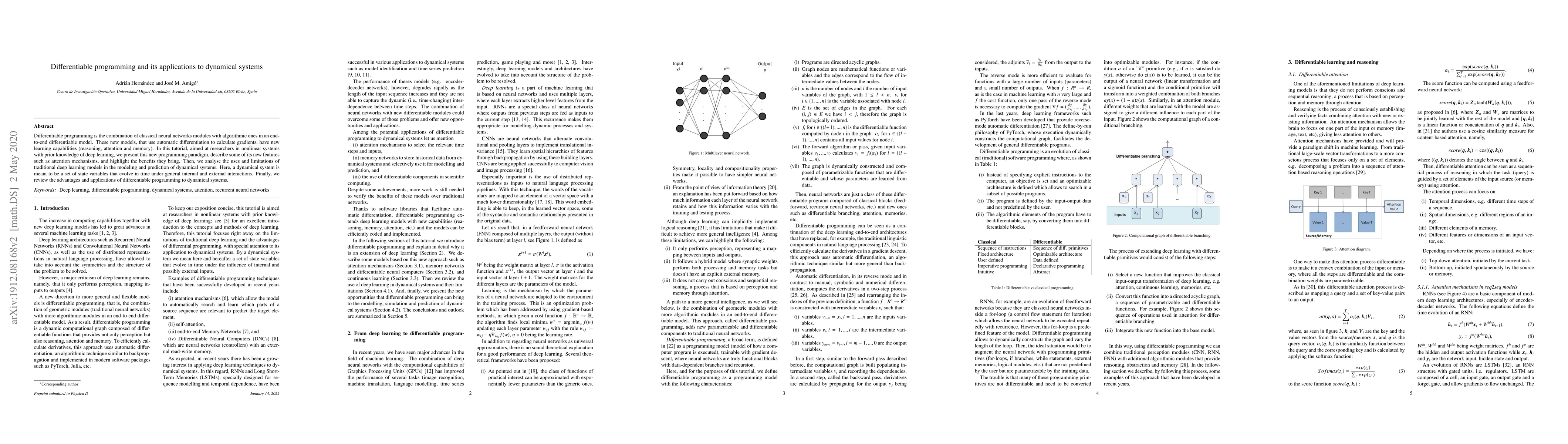 This paper introduces differentiable programming, merging neural and algorithmic modules for end-to-end learning, highlighting its capabilities like reasoning and attention. It discusses the benefits of this paradigm for modeling and predicting dynamical systems, comparing it with traditional deep learning methods.