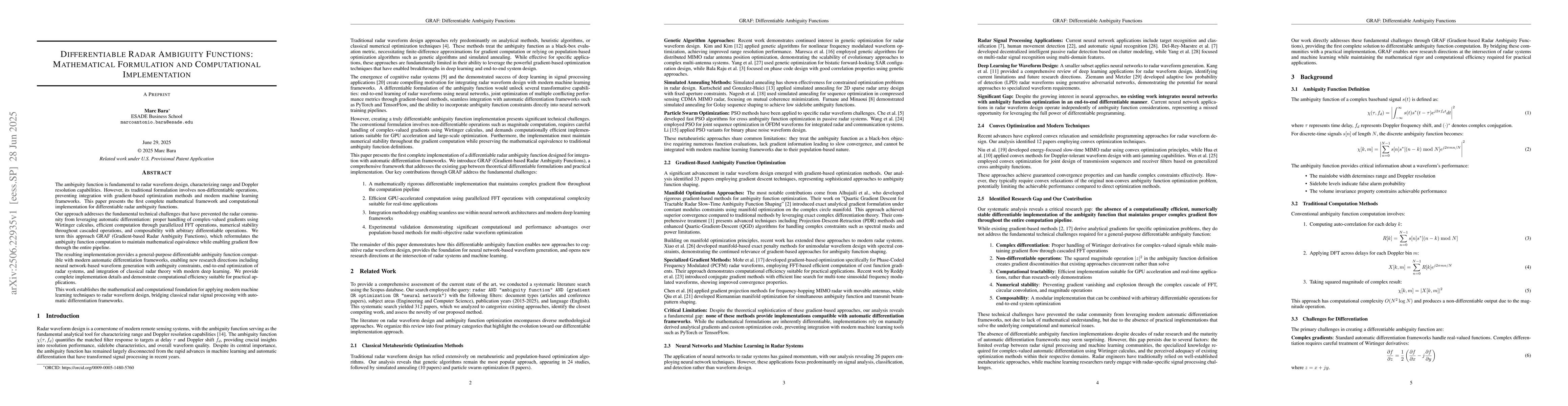 The ambiguity function is fundamental to radar waveform design, characterizing range and Doppler resolution capabilities. However, its traditional formulation involves non-differentiable operations, preventing integration with gradient-based optimization methods and modern machine learning frameworks. This paper presents the first complete mathematical framework and computational implementation for differentiable radar ambiguity functions. Our approach addresses the fundamental technical challenges that have prevented the radar community from leveraging automatic differentiation: proper handling of complex-valued gradients using Wirtinger calculus, efficient computation through parallelized FFT operations, numerical stability throughout cascaded operations, and composability with arbitrary differentiable operations. We term this approach GRAF (Gradient-based Radar Ambiguity Functions), which reformulates the ambiguity function computation to maintain mathematical equivalence while enabling gradient flow through the entire pipeline. The resulting implementation provides a general-purpose differentiable ambiguity function compatible with modern automatic differentiation frameworks, enabling new research directions including neural network-based waveform generation with ambiguity constraints, end-to-end optimization of radar systems, and integration of classical radar theory with modern deep learning. We provide complete implementation details and demonstrate computational efficiency suitable for practical applications. This work establishes the mathematical and computational foundation for applying modern machine learning techniques to radar waveform design, bridging classical radar signal processing with automatic differentiation frameworks.