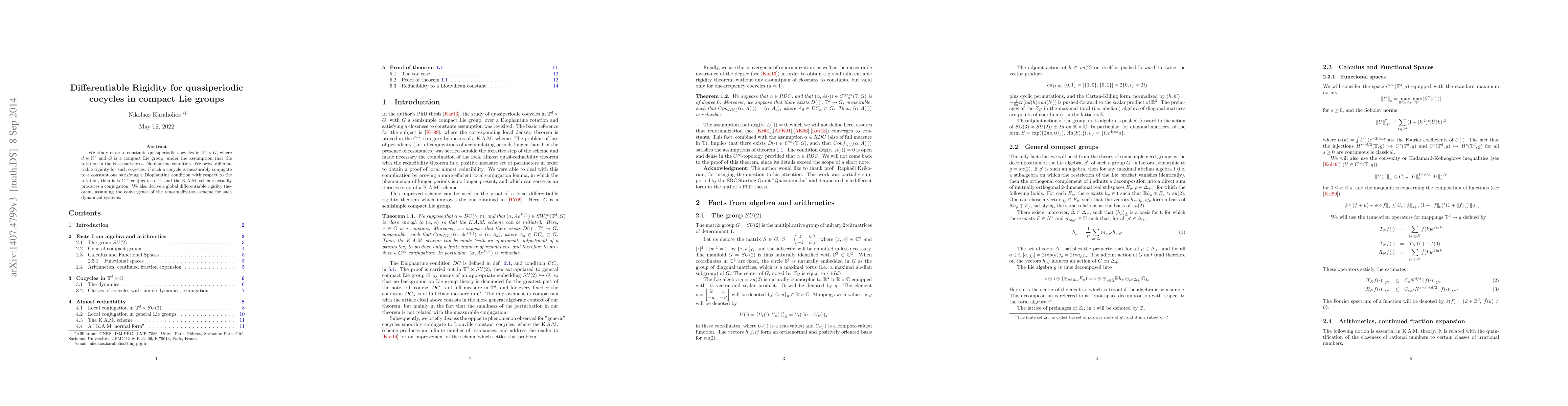 This paper investigates quasiperiodic cocycles in compact Lie groups under Diophantine rotation conditions, proving differentiable rigidity: measurable conjugacy to a constant cocycle implies $C^{\infty}$ conjugacy, and the K.A.M. scheme provides the conjugacy. It also establishes a global differentiable rigidity theorem under renormalization convergence.