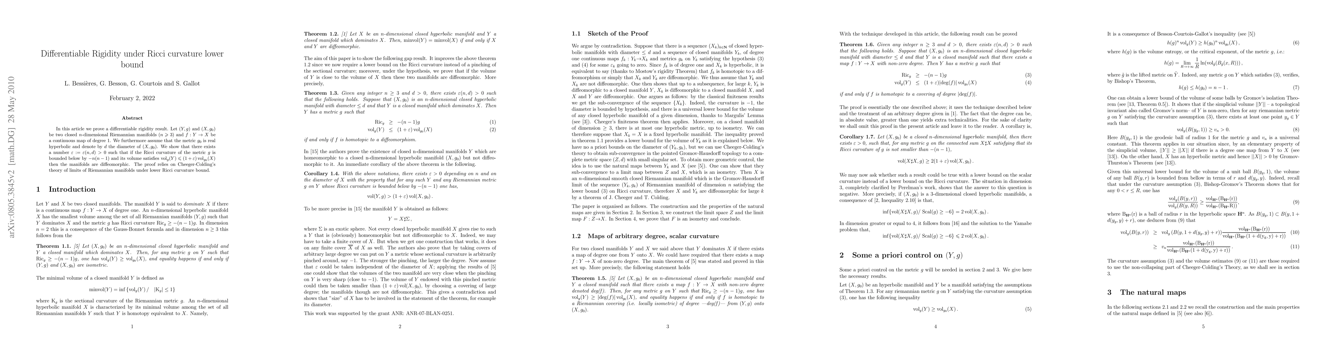 This paper proves a differentiable rigidity theorem for closed Riemannian manifolds under a lower Ricci curvature bound, showing that if two such manifolds have a continuous degree 1 map and meet certain volume and curvature conditions, they must be diffeomorphic. The proof utilizes Cheeger-Colding theory of limits of Riemannian manifolds.
