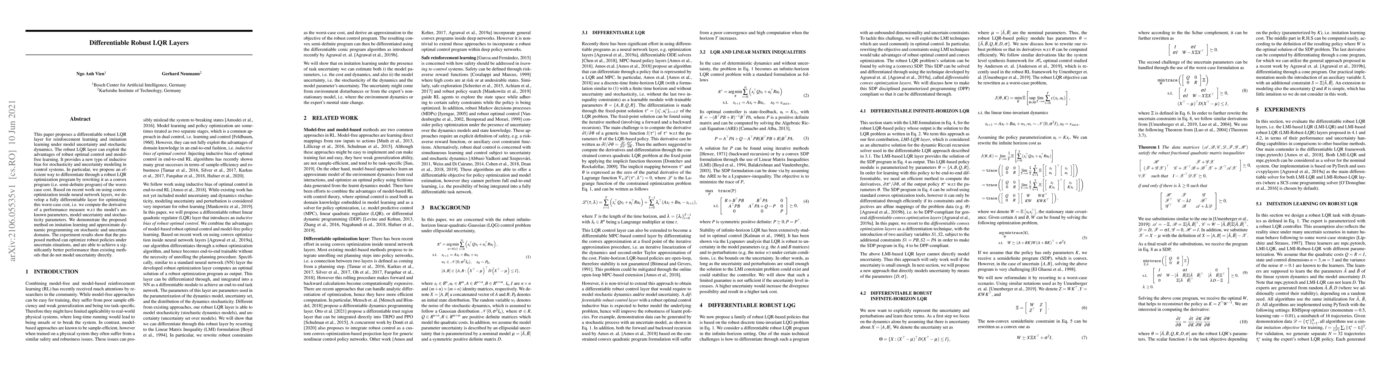 This paper introduces a differentiable robust LQR layer that combines robust optimal control with model-free learning for reinforcement and imitation learning under uncertainty. The proposed layer efficiently differentiates through robust LQR optimization and demonstrates superior performance in stochastic and uncertain domains compared to existing methods.