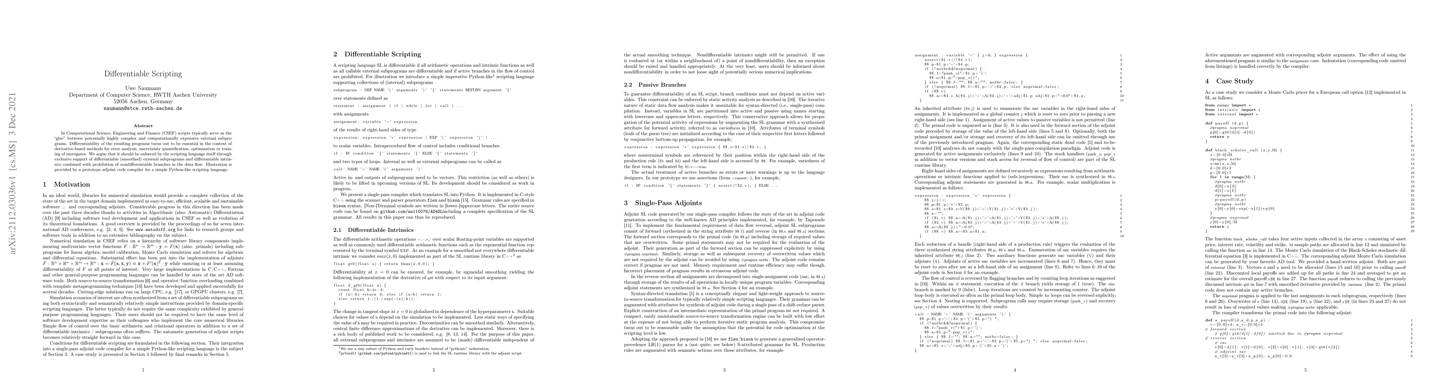 In Computational Science, Engineering and Finance (CSEF) scripts typically serve as the "glue" between potentially highly complex and computationally expensive external subprograms. Differentiability of the resulting programs turns out to be essential in the context of derivative-based methods for error analysis, uncertainty quantification, optimization or training of surrogates. We argue that it should be enforced by the scripting language itself through exclusive support of differentiable (smoothed) external subprograms and differentiable intrinsics combined with prohibition of nondifferentiable branches in the data flow. Illustration is provided by a prototype adjoint code compiler for a simple Python-like scripting language.
