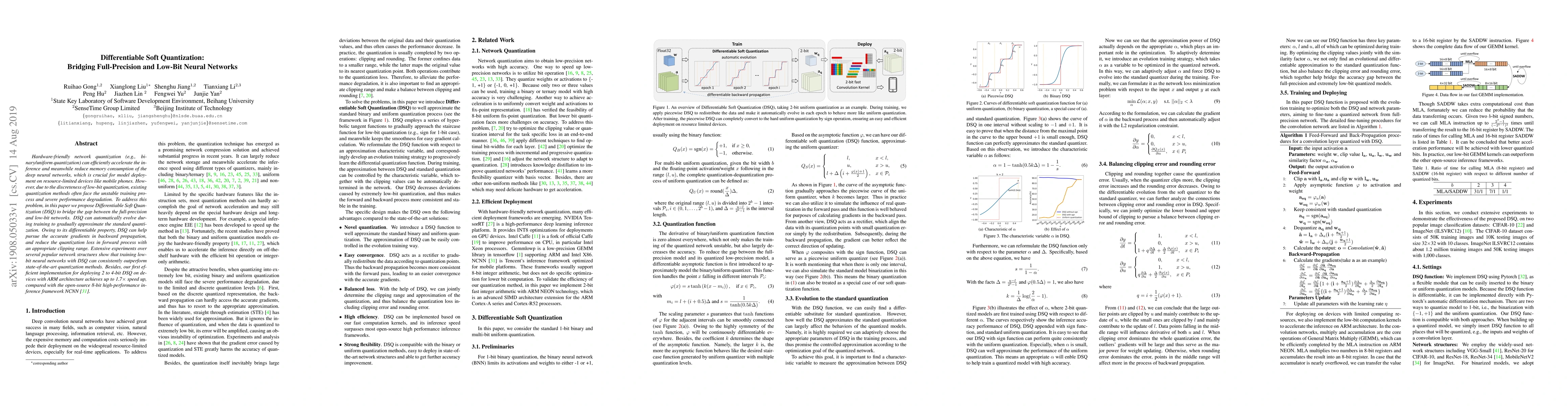 This paper proposes Differentiable Soft Quantization (DSQ) to bridge full-precision and low-bit neural networks, addressing training instability and performance degradation. DSQ's differentiable property enables accurate gradient propagation and reduced quantization loss, outperforming existing methods and achieving up to 1.7× speedup in low-bit inference on ARM devices.