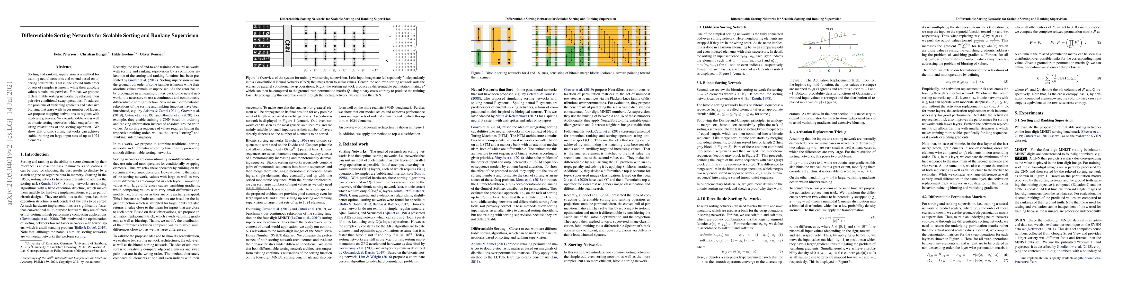 The paper proposes differentiable sorting networks to train neural networks using ordering constraints without supervision of absolute values. It addresses gradient issues by mapping activations to regions with moderate gradients and shows that bitonic sorting networks enable stable training for large input sets up to 1024 elements.
