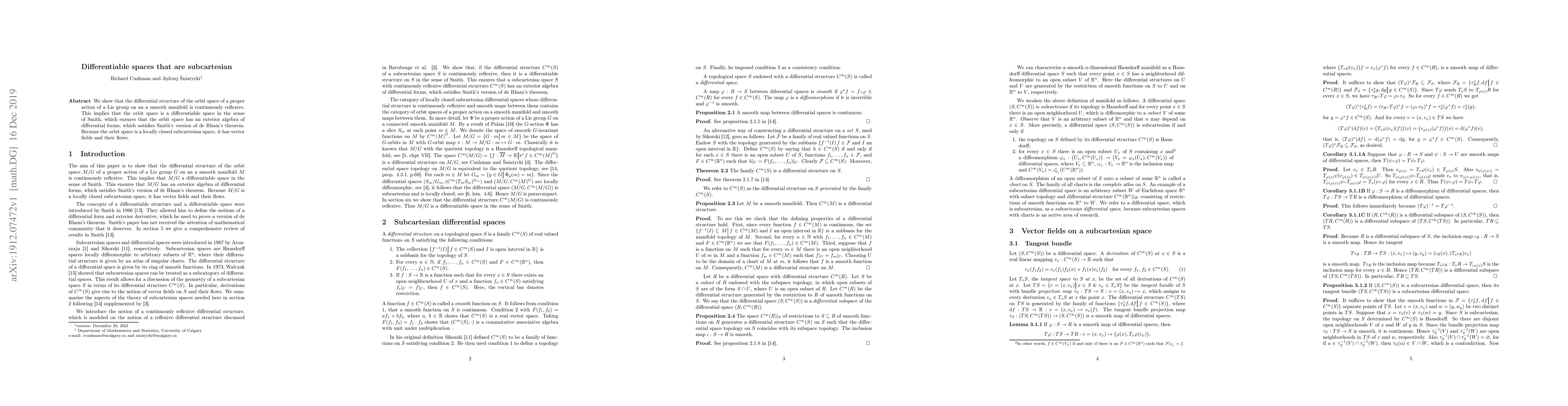 We show that the differential structure of the orbit space of a proper action of a Lie group on a smooth manifold is continuously reflexive. This implies that the orbit space is a differentiable space in the sense of Smith, which ensures that the orbit space has an exterior algebra of differenial forms, which statisfies Smith's version of de Rham's theorem. Because the orbit space is a locally closed subcartesian space, it has vector fields and their flows.