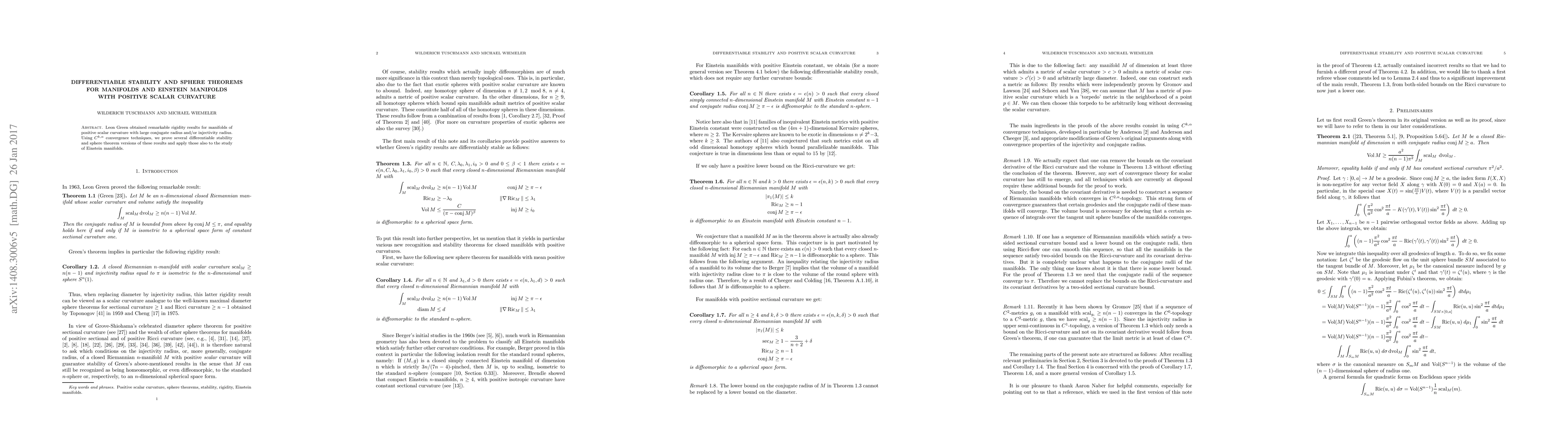 Leon Green obtained remarkable rigidity results for manifolds of positive scalar curvature with large conjugate radius and/or injectivity radius. Using $C^{k,\alpha}$ convergence techniques, we prove several differentiable stability and sphere theorem versions of these results and apply those also to the study of Einstein manifolds.