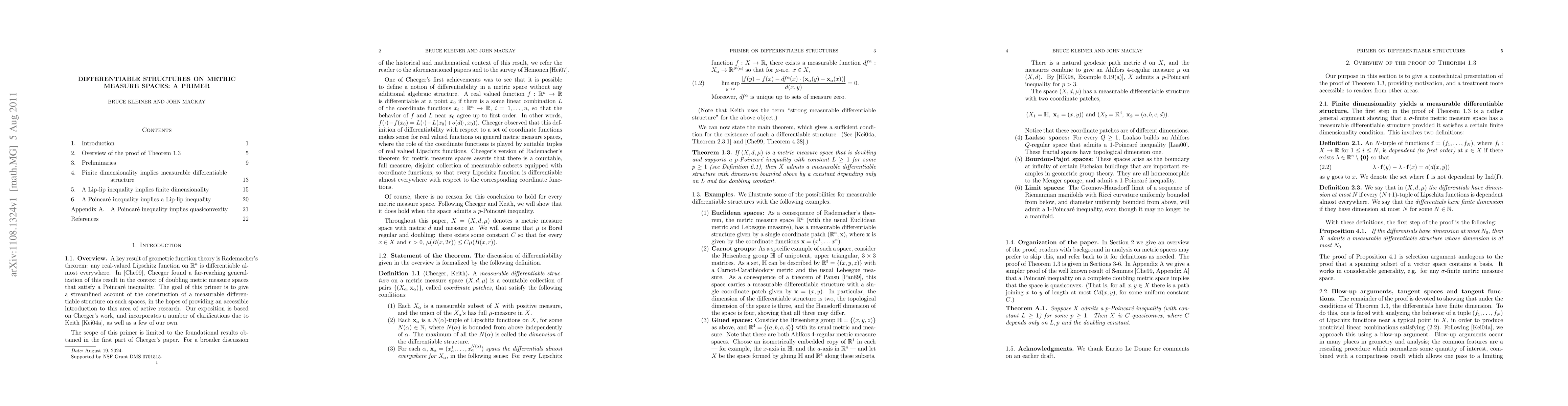 This is an exposition of the theory of differentiable structures on metric measures spaces, in the sense of Cheeger and Keith.