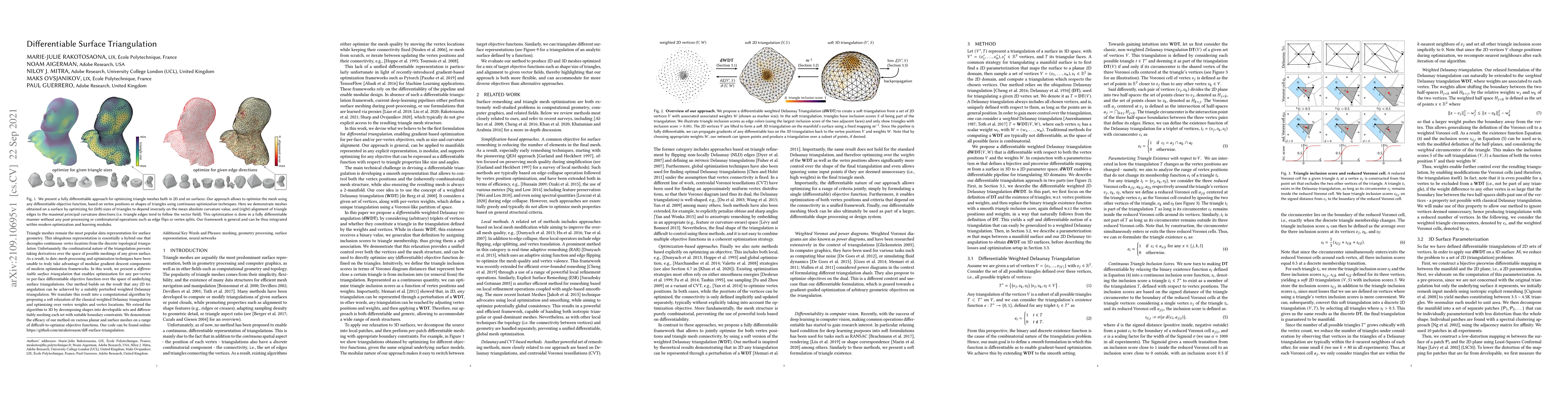 This paper introduces a differentiable surface triangulation method that allows gradient-based optimization over mesh triangulations, leveraging a soft relaxation of the weighted Delaunay triangulation. The approach is demonstrated to optimize various objective functions on both planar and 3D developable surfaces.