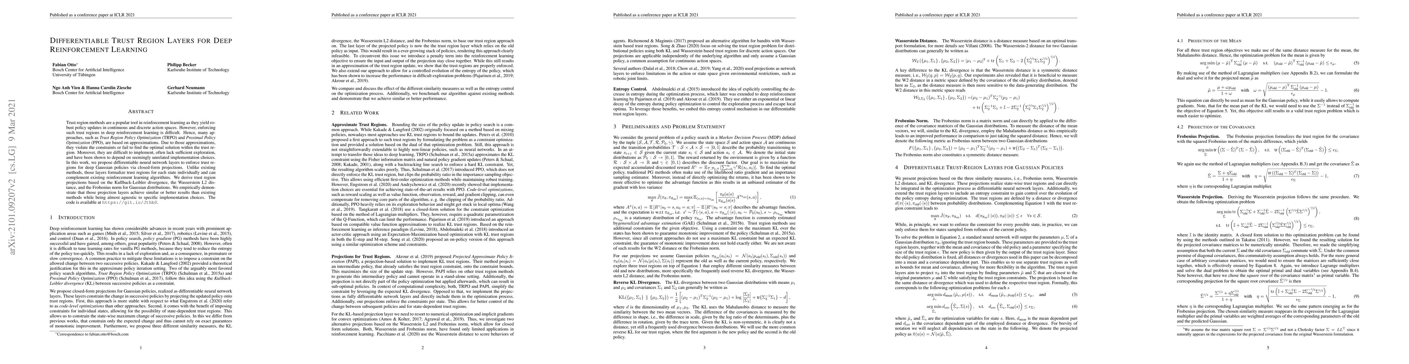 This paper proposes differentiable neural network layers for enforcing trust regions in deep reinforcement learning to improve policy updates, addressing the limitations of existing methods like TRPO and PPO. The new approach uses closed-form projections for Gaussian policies, achieving comparable or superior results without reliance on specific implementation choices.