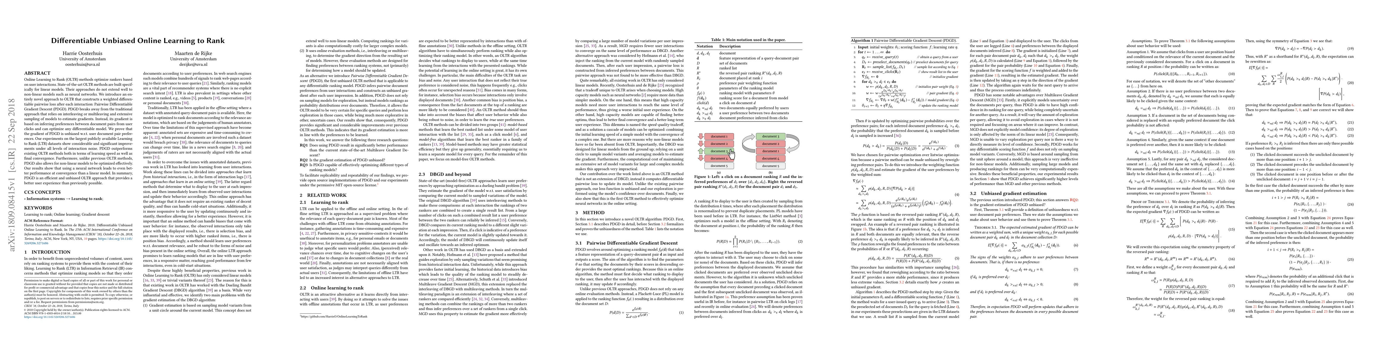 Online Learning to Rank (OLTR) methods optimize rankers based on user interactions. State-of-the-art OLTR methods are built specifically for linear models. Their approaches do not extend well to non-linear models such as neural networks. We introduce an entirely novel approach to OLTR that constructs a weighted differentiable pairwise loss after each interaction: Pairwise Differentiable Gradient Descent (PDGD). PDGD breaks away from the traditional approach that relies on interleaving or multileaving and extensive sampling of models to estimate gradients. Instead, its gradient is based on inferring preferences between document pairs from user clicks and can optimize any differentiable model. We prove that the gradient of PDGD is unbiased w.r.t. user document pair preferences. Our experiments on the largest publicly available Learning to Rank (LTR) datasets show considerable and significant improvements under all levels of interaction noise. PDGD outperforms existing OLTR methods both in terms of learning speed as well as final convergence. Furthermore, unlike previous OLTR methods, PDGD also allows for non-linear models to be optimized effectively. Our results show that using a neural network leads to even better performance at convergence than a linear model. In summary, PDGD is an efficient and unbiased OLTR approach that provides a better user experience than previously possible.