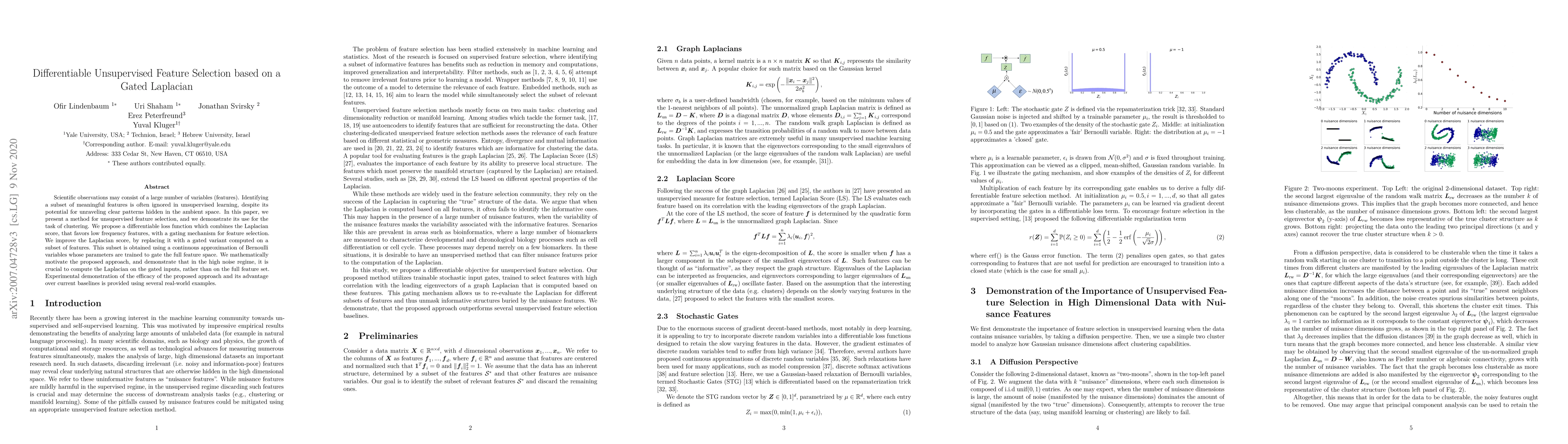 This paper introduces a differentiable unsupervised feature selection method using a gated Laplacian loss function to identify meaningful features for clustering. The method employs a gating mechanism to select a subset of features, improving upon traditional Laplacian scores and demonstrating superior performance in high noise conditions.