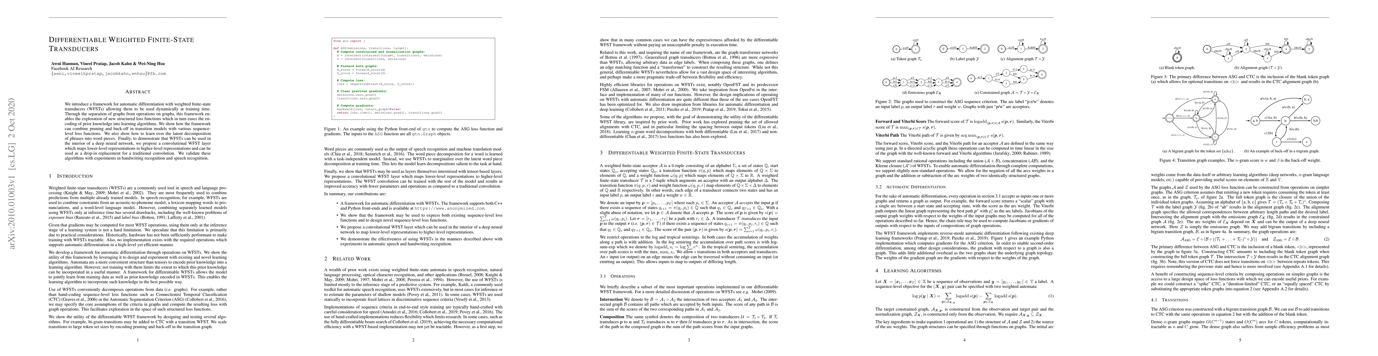 This paper presents a framework for automatic differentiation with weighted finite-state transducers (WFSTs), enabling dynamic use during training. It introduces a method to combine pruning and back-off in transition models with various sequence-level loss functions, and demonstrates its application in convolutional WFST layers for deep neural networks, validated through handwriting and speech recognition experiments.