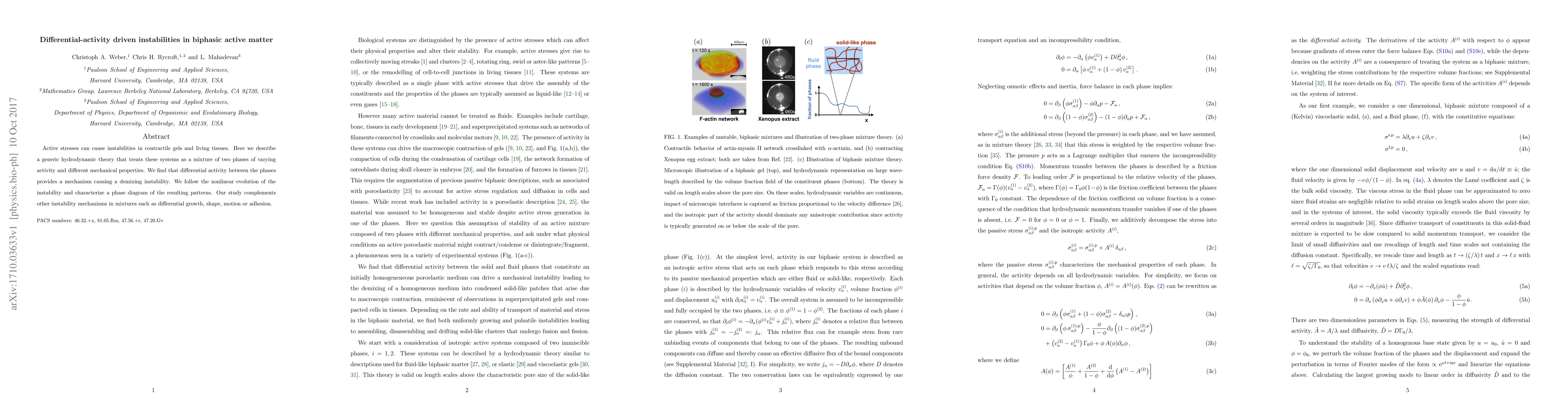 Active stresses can cause instabilities in contractile gels and living tissues. Here we describe a generic hydrodynamic theory that treats these systems as a mixture of two phases of varying activity and different mechanical properties. We find that differential activity between the phases provides a mechanism causing a demixing instability. We follow the nonlinear evolution of the instability and characterize a phase diagram of the resulting patterns. Our study complements other instability mechanisms in mixtures such as differential growth, shape, motion or adhesion.
