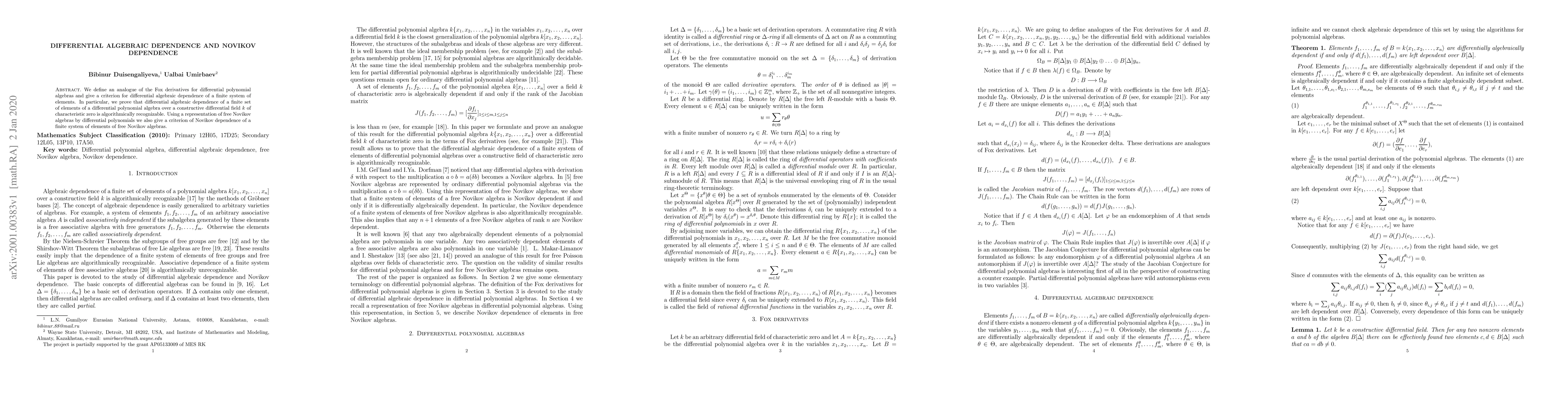 We define an analogue of the Fox derivatives for differential polynomial algebras and give a criterion for differential algebraic dependence of a finite system of elements. In particular, we prove that differential algebraic dependence of a finite set of elements of a differential polynomial algebra over a constructive differential field $k$ of characteristic zero is algorithmically recognizable. Using a representation of free Novikov algebras by differential polynomials we also give a criterion of Novikov dependence of a finite system of elements of free Novikov algebras.